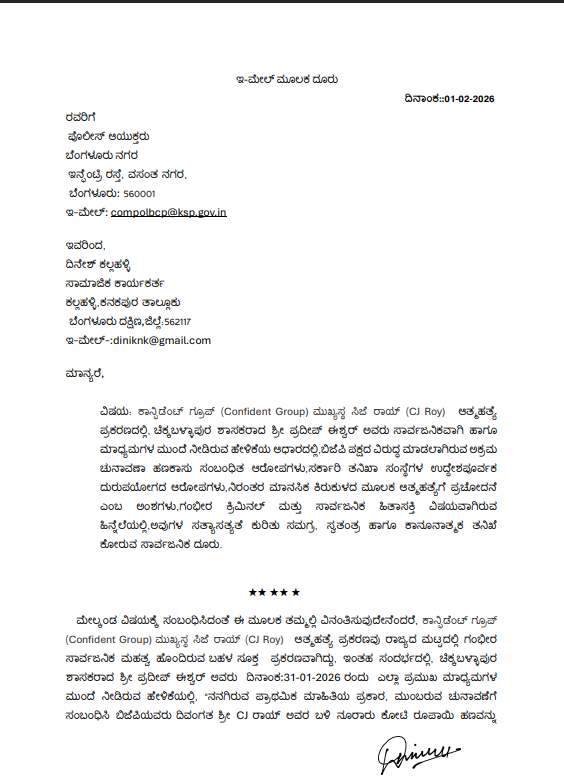 ಕಾನ್ಸಿಡೆಂಟ್ ಗ್ರೂಪ್ ಮುಖ್ಯಸ್ಥ ಸಿಜೆ ರಾಯ್ ಆತ್ಮಹತ್ಯೆ ಪ್ರಕರಣವು ರಾಜ್ಯದ ಮಟ್ಟದಲ್ಲಿ ಗಂಭೀರ ಪ್ರಕರಣವಾಗಿದ್ದು, ಇಂತಹ ಸಂದರ್ಭದಲ್ಲಿ, ಚಿಕ್ಕಬಳ್ಳಾಪುರ ಶಾಸಕ ಪ್ರದೀಪ್ ಈಶ್ವರ್ ಶನಿವಾರ ಎಲ್ಲಾ ಪ್ರಮುಖ ಮಾಧ್ಯಮಗಳ ಮುಂದೆ ನೀಡಿರುವ ಹೇಳಿಕೆಯಲ್ಲಿ, “ನನಗಿರುವ ಪ್ರಾಥಮಿಕ ಮಾಹಿತಿಯ ಪ್ರಕಾರ, ಮುಂಬರುವ ಚುನಾವಣೆಗೆ ಸಂಬಂಧಿಸಿ ಬಿಜೆಪಿಯವರು ಸಿಜೆ ರಾಯ್ ಅವರ ಬಳಿ ನೂರಾರು ಕೋಟಿ ರೂಪಾಯಿ ಹಣವನ್ನು ಚುನಾವಣಾ ನಿಧಿ ಹೆಸರಿನಲ್ಲಿ ಕೇಳಿದ್ದಾರೆ. ಆ ಹಣ ನೀಡಲು ನಿರಾಕರಿಸಿದ ಕಾರಣದಿಂದಾಗಿ, ಕಳೆದ ಒಂದು ತಿಂಗಳಿನಿಂದ ಇನ್ಕಂ ಟ್ಯಾಕ್ಸ್ ಇಲಾಖೆಯನ್ನು ದುರುಪಯೋಗಪಡಿಸಿಕೊಂಡು, ರಾಯ್ ಅವರನ್ನು ಟಾರ್ಗೆಟ್ ಮಾಡಿ ನಿರಂತರ ಕಿರುಕುಳ ನೀಡಲಾಗಿದೆ” ಎಂದು ಅತ್ಯಂತ ಗಂಭೀರ ಆರೋಪ ಮಾಡಿದ್ದರು.