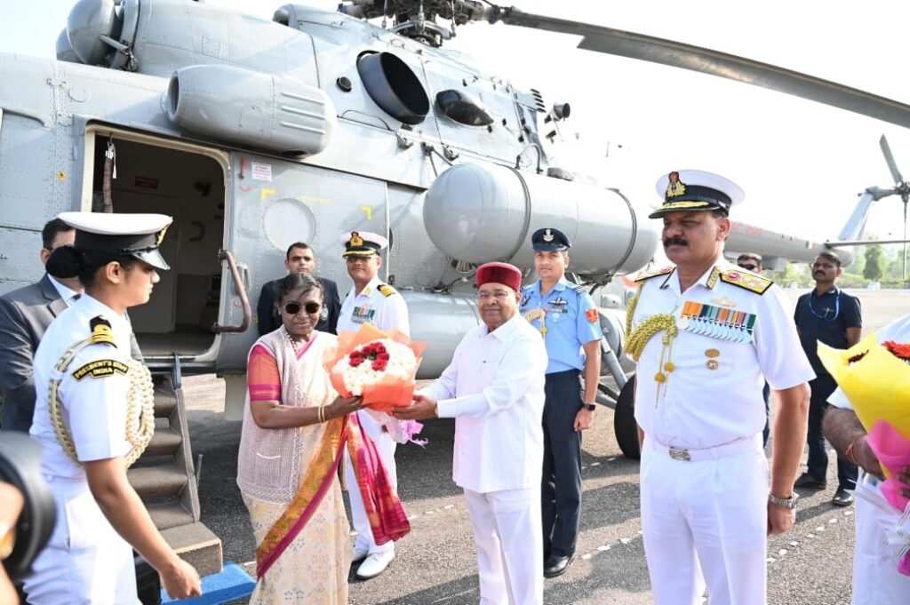 ನೌಕಾನೆಲೆಗೆ ಆಗಮಿಸಿದ ರಾಷ್ಟ್ರಪತಿಯವರನ್ನು ರಾಜ್ಯಪಾಲ ಥಾವರ್ ಚಂದ್ ಗೆಹ್ಲೋಟ್, ಮೀನುಗಾರಿಕೆ ಹಾಗೂ ಜಿಲ್ಲಾ ಉಸ್ತುವಾರಿ ಸಚಿವ ಮಂಕಾಳ ಎಸ್. ವೈದ್ಯ ಅವರು ಆತ್ಮೀಯವಾಗಿ ಬರಮಾಡಿಕೊಂಡರು. ಈ ಸಂದರ್ಭದಲ್ಲಿ ಪ್ರಾದೇಶಿಕ ಆಯುಕ್ತೆ ಜಯಂತಿ, ಜಿಲ್ಲಾಧಿಕಾರಿ ಕೆ. ಲಕ್ಷ್ಮಿಪ್ರಿಯಾ, ಎಡಿಜಿಪಿ ಹಿತೇಂದ್ರ, ಐಜಿಪಿ ಅಮಿತ್ ಸಿಂಗ್ ಹಾಗೂ ಜಿಲ್ಲಾ ಪೊಲೀಸ್ ವರಿಷ್ಠಾಧಿಕಾರಿ ದೀಪನ್ ಎಂ.ಎನ್. ಉಪಸ್ಥಿತರಿದ್ದರು. ನೌಕಾಪಡೆಯ ಪರವಾಗಿ ಫೀಲ್ಡ್ ಆಫೀಸರ್ ಕಮಾಂಡೆಂಟ್ ರಿಯರ್ ಅಡ್ಮಿರಲ್ ವಿಕ್ರಂ ಮೆನನ್ ಮತ್ತು ಹಿರಿಯ ಅಧಿಕಾರಿಗಳು ಗೌರವ ಸಲ್ಲಿಸಿದರು.
