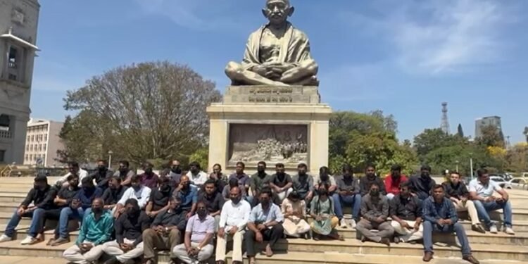 ಬೆಂಗಳೂರು | ವಿಧಾನಸೌಧದಲ್ಲಿ ಮಾಧ್ಯಮಗಳಿಗೆ ವಿಧಿಸಿರುವ ನಿರ್ಬಂಧದ ವಿರುದ್ಧ ಮಾಧ್ಯಮ ಪ್ರತಿನಿಧಿಗಳು ಇಂದು ಮೌನ ಪ್ರತಿಭಟನೆ ನಡೆಸಿದ್ದಾರೆ. ವಿಧಾನಸೌಧ-ವಿಕಾಸಸೌಧದ ಮಧ್ಯದಲ್ಲಿರುವ ಮಹಾತ್ಮ ಗಾಂಧಿ ಪ್ರತಿಮೆ ಸಮೀಪ ಧರಣಿ ಮಾಡಿದ ಪತ್ರಕರ್ತರು, ಕಪ್ಪು ಬಟ್ಟೆ ಧರಿಸಿ, ಮುಖಕ್ಕೆ ಕಪ್ಪು ಮಾಸ್ಕ್ ಹಾಕಿಕೊಂಡು ತಮ್ಮ ಆಕ್ರೋಶ ವ್ಯಕ್ತಪಡಿಸಿದ್ದಾರೆ.