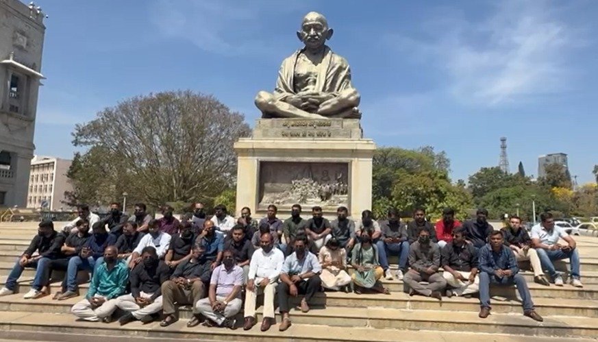ಬೆಂಗಳೂರು | ವಿಧಾನಸೌಧದಲ್ಲಿ ಮಾಧ್ಯಮಗಳಿಗೆ ವಿಧಿಸಿರುವ ನಿರ್ಬಂಧದ ವಿರುದ್ಧ ಮಾಧ್ಯಮ ಪ್ರತಿನಿಧಿಗಳು ಇಂದು ಮೌನ ಪ್ರತಿಭಟನೆ ನಡೆಸಿದ್ದಾರೆ. ವಿಧಾನಸೌಧ-ವಿಕಾಸಸೌಧದ ಮಧ್ಯದಲ್ಲಿರುವ ಮಹಾತ್ಮ ಗಾಂಧಿ ಪ್ರತಿಮೆ ಸಮೀಪ ಧರಣಿ ಮಾಡಿದ ಪತ್ರಕರ್ತರು, ಕಪ್ಪು ಬಟ್ಟೆ ಧರಿಸಿ, ಮುಖಕ್ಕೆ ಕಪ್ಪು ಮಾಸ್ಕ್ ಹಾಕಿಕೊಂಡು ತಮ್ಮ ಆಕ್ರೋಶ ವ್ಯಕ್ತಪಡಿಸಿದ್ದಾರೆ.