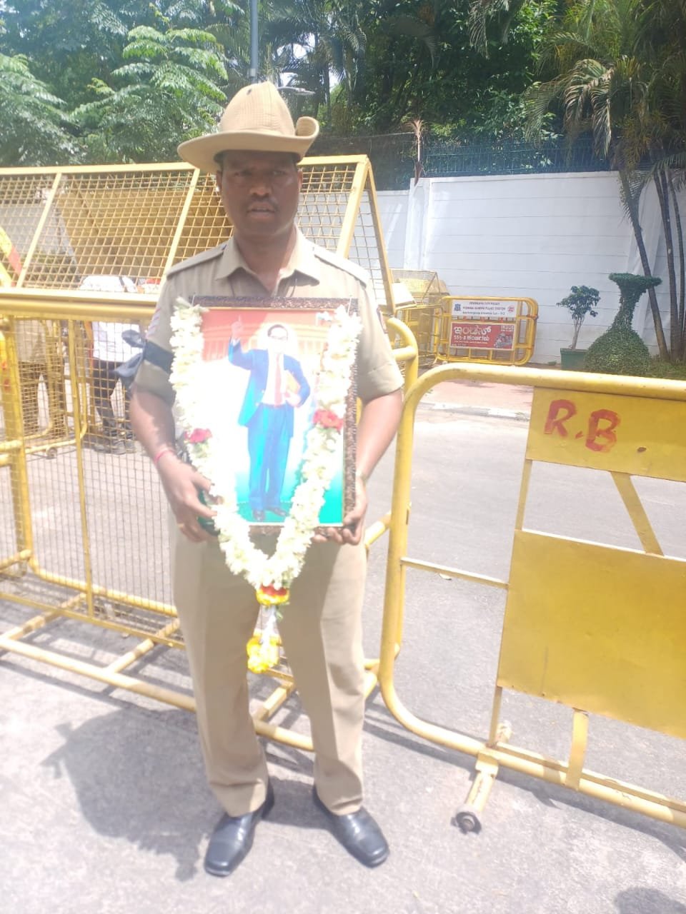 ಹೆಡ್ ಕಾನ್ಸ್ಟೇಬಲ್ (Head Constable) ನರಸಿಂಹರಾಜು ಸರ್ಕಾರದ ನಡೆ ಖಂಡಿಸಿ ರಾಜ್ಯಪಾಲರಿಗೆ ದೂರು ನೀಡಲು ತೆರಳಿದ್ದರು. ಈ ಸಂದರ್ಭದಲ್ಲಿ ಅಂಬೇಡ್ಕರ್ ಫೋಟೋ ಹಿಡಿದು, ಕಪ್ಪುಪಟ್ಟಿ ಧರಿಸಿ ರಾಜಭವನದ ಎದುರು ಪ್ರತಿಭಟನೆ ನಡೆಸಿದ್ದಾರೆ.