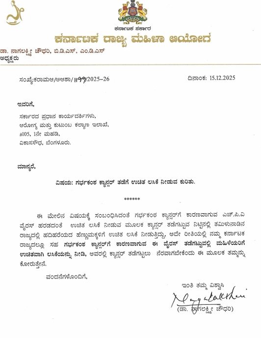 ಬೆಂಗಳೂರು : ತಮಿಳುನಾಡಿನ ರೀತಿ ಕರ್ನಾಟಕದ ಹದಿಹರೆಯದ ಹೆಣ್ಣುಮಕ್ಕಳಿಗೆ ಗರ್ಭಕಂಠ ಕ್ಯಾನ್ಸರ್ ತಡೆಗೆ ಉಚಿತ ಲಸಿಕೆ ನೀಡಬೇಕೆಂದು ರಾಜ್ಯ ಮಹಿಳಾ ಆಯೋಗದ ಅಧ್ಯಕ್ಷೆ ನಾಗಲಕ್ಷ್ಮೀ ಚೌಧರಿ ಅವರು ಸರ್ಕಾರಕ್ಕೆ ಪತ್ರ ಬರೆದಿದ್ದಾರೆ.