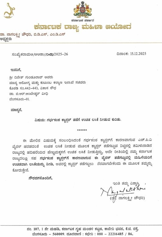 ಅದೇ ರೀತಿಯಲ್ಲಿ ನಮ್ಮ ಕರ್ನಾಟಕ ರಾಜ್ಯದಲ್ಲೂ ಸಹ ಗರ್ಭಕಂಠ ಕ್ಯಾನ್ಸರ್ಗೆ ಕಾರಣವಾಗುವ ಈ ವೈರಸ್ ತಡೆಗಟ್ಟುವಲ್ಲಿ ಮಹಿಳೆಯರಿಗೆ ಉಚಿತವಾಗಿ ಲಸಿಕೆಯನ್ನು ನೀಡಿ, ಅವರಲ್ಲಿ ಕ್ಯಾನ್ಸರ್ ತಡೆಗಟ್ಟಲು ನೆರವಾಗಬೇಕೆಂದು ಆರೋಗ್ಯ ಸಚಿವ ದಿನೇಶ್ ಗುಂಡೂರಾವ್ ಹಾಗೂ ಸರ್ಕಾರದ ಪ್ರಧಾನ ಕಾರ್ಯದರ್ಶಿಗೆ ನಾಗಲಕ್ಷ್ಮೀ ಚೌಧರಿ ಅವರು ಪತ್ರದ ಮೂಲಕ ಮನವಿ ಮಾಡಿದ್ದಾರೆ.