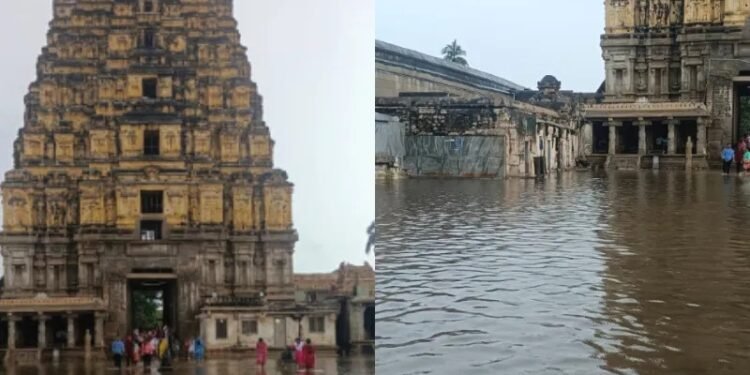 ಐತಿಹಾಸಿಕ ಹಂಪಿಯ ವಿರೂಪಾಕ್ಷ ದೇಗುಲದ ಆವರಣದಲ್ಲಿ ಮಳೆಯಿಂದಾಗಿ ಮೊಣಕಾಲುದ್ಧ ನೀರು ನಿಂತಿದ್ದು, ಪರಿಣಾಮ ದೇವಸ್ಥಾನಕ್ಕೆ ಬರುವ ಭಕ್ತರು ಹಾಗೂ ಪ್ರವಾಸಿಗರಿಗೆ ಸಮಸ್ಯೆ ಎದುರಾಗಿದೆ.