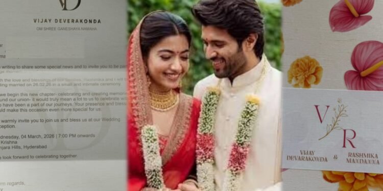 ರಶ್ಮಿಕಾ ಮಂದಣ್ಣ ಹಾಗೂ ವಿಜಯ್ ದೇವರಕೊಂಡ ವಿವಾಹ ಆಗುತ್ತಿರುವುದು ಅಧಿಕೃತವಾಗಿದೆ. ಅತಿಥಿಗಳಿಗೆ ನೀಡಲಾದ ಆಮಂತ್ರಣ ಪತ್ರಿಕೆ ವೈರಲ್ ಆಗಿದೆ. ಅವರ ವಿವಾಹ ಫೆಬ್ರವರಿ 26ರಂದು ಅದ್ಧೂರಿಯಾಗಿ ನಡೆಯಲಿದೆ. ಆತ್ಮೀಯ ಸ್ನೇಹಿತರು ಹಾಗೂ ಕುಟುಂಬದವರ ಜೊತೆ ವಿಜಯ್ ದೇವೆಕೊಂಡ ಮತ್ತು ರಶ್ಮಿಕಾ ವಿವಾಹವಾಗಲಿದ್ದಾರೆ. ಈ ವಿಷಯ ಅವರ ಅಭಿಮಾನಿಗಳಿಗೆ ಖುಷಿ ನೀಡಿದೆ.
