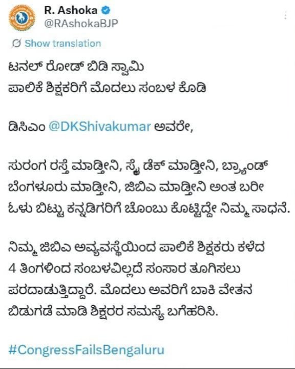 ಪಾಲಿಕೆ ಶಾಲೆಗಳಲ್ಲಿ ಮಕ್ಕಳಿಗೆ ಗುಣಮಟ್ಟದ ಶಿಕ್ಷಣ ಒದಗಿಸಲು ಅಗತ್ಯ ಶಿಕ್ಷಕರ ವ್ಯವಸ್ಥೆ ಮಾಡುತ್ತೇವೆಂದೂ, ಅತಿಥಿ ಶಿಕ್ಷಕ/ಉಪನ್ಯಾಸಕರಿಗೆ ನಿಗದಿತ ವೇತನ ನೀಡುತ್ತೇವೆಂದೂ ಡಿಸಿಎಂ ಶಿವಕುಮಾರ್ ಭರವಸೆ ನೀಡಿದ್ದರು. ಈ ಭರವಸೆಗಳು ಕಾರ್ಯರೂಪಕ್ಕೆ ಬರದ ಕಾರಣ ಟ್ವೀಟ್ ಮಾಡಿರುವ ಆರ್ ಅಶೋಕ್, ‘ಟನಲ್ ರೋಡ್ ಬಿಡಿ ಸ್ವಾಮಿ, ಪಾಲಿಕೆ ಶಿಕ್ಷಕರಿಗೆ ಮೊದಲು ಸಂಬಳ ಕೊಡಿ. ಸುರಂಗ ರಸ್ತೆ ಮಾಡುತ್ತೇನೆ, ಸ್ಕೈ ಡೆಕ್ ಮಾಡುತ್ತೇನೆ, ಬ್ರ್ಯಾಂಡ್ ಬೆಂಗಳೂರು ಮಾಡುತ್ತೇನೆ, ಜಿಬಿಎ ಮಾಡುತ್ತೇನೆ ಎಂದು ಬರೀ ಓಳು ಬಿಟ್ಟು ಕನ್ನಡಿಗರಿಗೆ ಚೊಂಬು ಕೊಟ್ಟಿದ್ದೇ ನಿಮ್ಮ ಸಾಧನೆ.