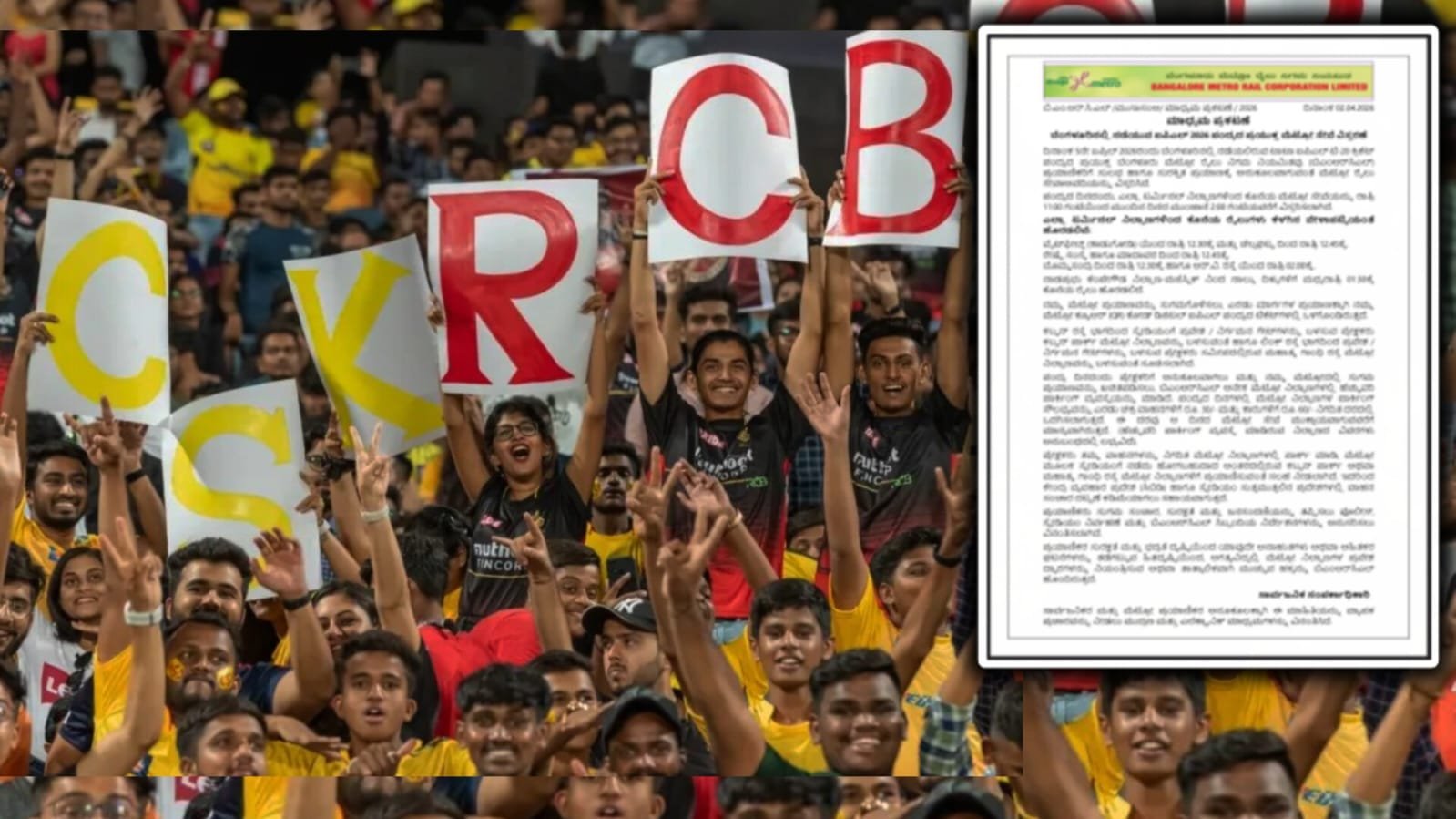ಬೆಂಗಳೂರು : ನಾಳೆ ಆರ್ಸಿಬಿ ಮತ್ತು ಸಿಎಸ್ಕೆ ನಡುವಿನ ಹೈವೋಲ್ಟೇಜ್ IPL ಪಂದ್ಯವನ್ನು ಗಮನದಲ್ಲಿಟ್ಟುಕೊಂಡು ಬೆಂಗಳೂರು ಮೆಟ್ರೋ ರೈಲು ನಿಗಮ ಲಿಮಿಟೆಡ್ ಕ್ರಿಕೆಟ್ ಅಭಿಮಾನಿಗಳಿಗೆ ಸಿಹಿ ಸುದ್ದಿ ನೀಡಿದೆ. ಪಂದ್ಯ ನಡೆಯುವ ಹಿನ್ನೆಲೆಯಲ್ಲಿ ನಮ್ಮ ಮೆಟ್ರೋ ಸೇವೆಯನ್ನು ವಿಶೇಷವಾಗಿ ವಿಸ್ತರಿಸಲಾಗಿದೆ. ಸಾಮಾನ್ಯವಾಗಿ ರಾತ್ರಿ 11 ಗಂಟೆಗೆ ಮುಕ್ತಾಯಗೊಳ್ಳುವ ಮೆಟ್ರೋ ಸೇವೆ, ತಡರಾತ್ರಿ 2:00 ಗಂಟೆಯವರೆಗೆ ಲಭ್ಯವಿರಲಿದೆ. ಇದರಿಂದ ಪಂದ್ಯ ವೀಕ್ಷಣೆ ಬಳಿಕ ಮನೆಗೆ ಮರಳಲು ಅಭಿಮಾನಿಗಳಿಗೆ ಹೆಚ್ಚಿನ ಅನುಕೂಲವಾಗಲಿದೆ.