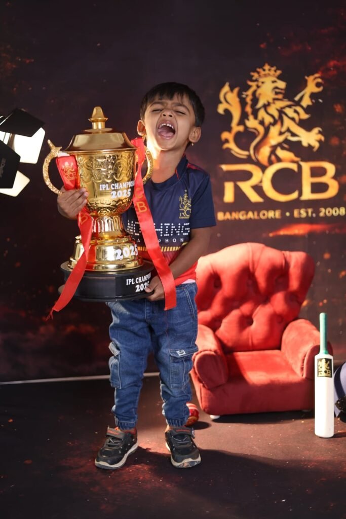 ಆರ್ಸಿಬಿ ಜರ್ಸಿ ಧರಿಸಿ ಬಾಲಿಂಗ್ ಮತ್ತು ಬ್ಯಾಟಿಂಗ್ ಮಾಡುವ ಮೂಲಕ ಸಣ್ಣ ಕಪ್ ಹಿಡಿದು ಫೋಟೋ ಶೂಟ್ ಮಾಡಿಸುವ ಮೂಲಕ ಮೂರುವರೆ ವರ್ಷದ ಲಿಶಾನ್ ಡಿ ಜೈನ್ ಆರ್ಸಿಬಿ ತಂಡಕ್ಕೆ ಶುಭಾಶಯ ಕೋರಿದ್ದಾನೆ.