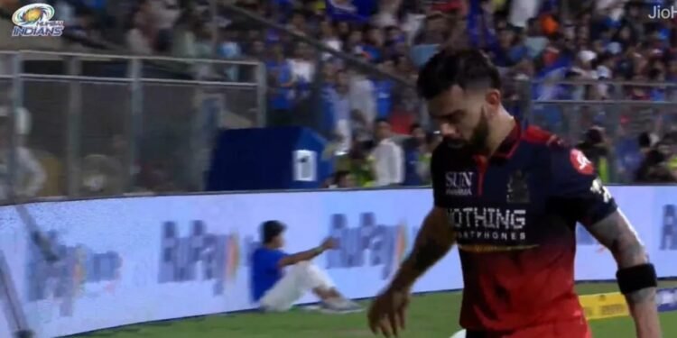 ಅರ್ಧಶತಕ ಪೂರೈಸಿದ ಮರು ಎಸೆತದಲ್ಲೇ ಮುಂಬೈ ನಾಯಕ ಹಾರ್ದಿಕ್ ಪಾಂಡ್ಯ ಎಸೆದ ಫುಲ್ ಟಾಸ್ ಎಸೆತವನ್ನು ಬೃಹತ್ ಹೊಡೆತಕ್ಕೆ ಯತ್ನಿಸಿದ ಕೊಹ್ಲಿ, ಟೈಮಿಂಗ್ ತಪ್ಪಿ ಬೌಂಡರಿ ಲೈನ್ ಬಳಿ ಸೂರ್ಯಕುಮಾರ್ ಯಾದವ್‌ಗೆ ಕ್ಯಾಚಿತ್ತು ನಿರ್ಗಮಿಸಿದರು. ವಿಕೆಟ್ ಒಪ್ಪಿಸಿ ಹೊರನಡೆಯುವಾಗ ಅಸಮಾಧಾನದ ಕಟ್ಟೆ ಒಡೆದಿತ್ತು. ಬೌಂಡರಿ ಲೈನ್ ದಾಟುತ್ತಿದ್ದಂತೆಯೇ ಮೊದಲು ತಮ್ಮ ಗ್ಲೌಸ್‌ಗಳನ್ನು ಕಿತ್ತು ಎಸೆದರು. ನಂತರ ಅದೇ ಕೋಪದಲ್ಲಿ ಹೆಲ್ಮೆಟ್ ಅನ್ನು ಕೂಡ ಬಿಸಾಕಿ ಪೆವಿಲಿಯನ್ ಮೆಟ್ಟಿಲೇರಿದರು.