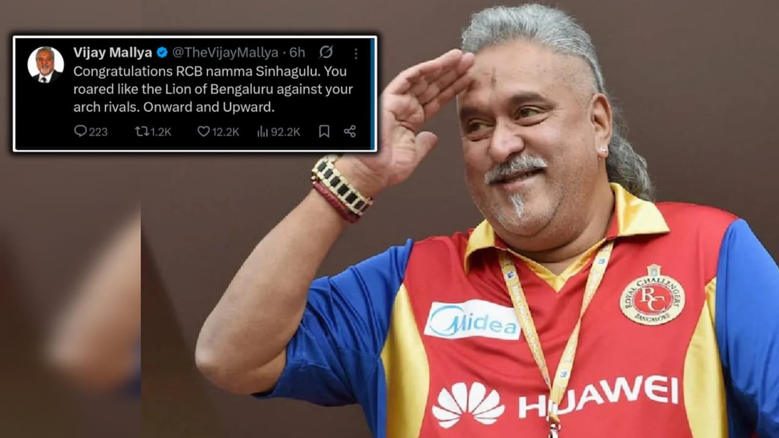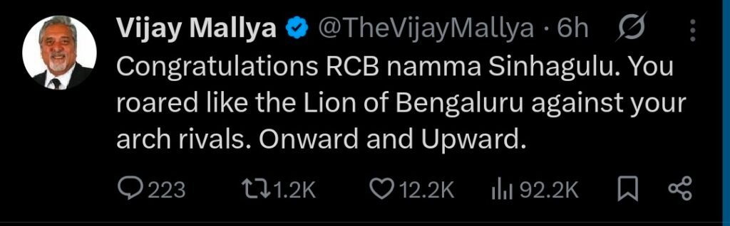 ಎಕ್ಸ್ನಲ್ಲಿ ಪ್ರತಿಕ್ರಿಯಿಸಿರುವ ವಿಜಯ ಮಲ್ಯ, ನಮ್ಮ ಆರ್ಸಿಬಿ ಸಿಂಹಗಳಿಗೆ ಅಭಿನಂದನೆಗಳು. ನಿಮ್ಮ ಬದ್ಧ ವೈರಿಗಳ ವಿರುದ್ಧ ನೀವು ಬೆಂಗಳೂರಿನ ಸಿಂಹದಂತೆ ಘರ್ಜಿಸಿದ್ದೀರಿ. ಇದೇ ರೀತಿ ಮುಂದುವರಿಸಿ,” ಎಂದು ಶುಭಾಶಯ ತಿಳಿಸಿದ್ದಾರೆ.
