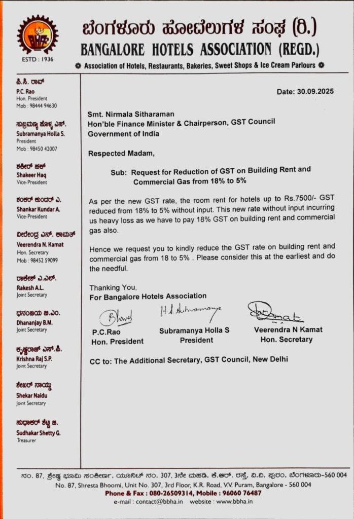 ಕೇಂದ್ರ ಸರ್ಕಾರ ಹೊಟೇಲ್ ರೂಂ ಬಾಡಿಗೆಯ GST ಇಳಿಕೆ ಮಾಡಿದೆ, 18% ಇದ್ದ GSTಯನ್ನ 5%ಗೆ ಇಳಿಸಿದೆ. ಇದರಿಂದ ಹೊಟೇಲ್ ಉದ್ದಿಮೆದಾರರಿಗೆ ನಷ್ಟವಾಗುತ್ತಿದೆ. ಹೊಟೇಲ್ ಬಿಲ್ಡಿಂಗ್ ರೆಂಟ್ ಕೂಡ ನಮಗೆ ಹೊರೆಯಾಗುತ್ತಿದೆ. ಹೀಗಾಗಿ ಬಿಲ್ಡಿಂಗ್ ರೆಂಟ್ ಹಾಗೂ ಕಮರ್ಷಿಯಲ್ ಗ್ಯಾಸ್‌ನ GST ಇಳಿಸುವಂತೆ ಬೆಂಗಳೂರು ಹೋಟೆಲ್ ಮಾಲೀಕರ ಸಂಘ ಮನವಿ ಮಾಡಿದೆ.