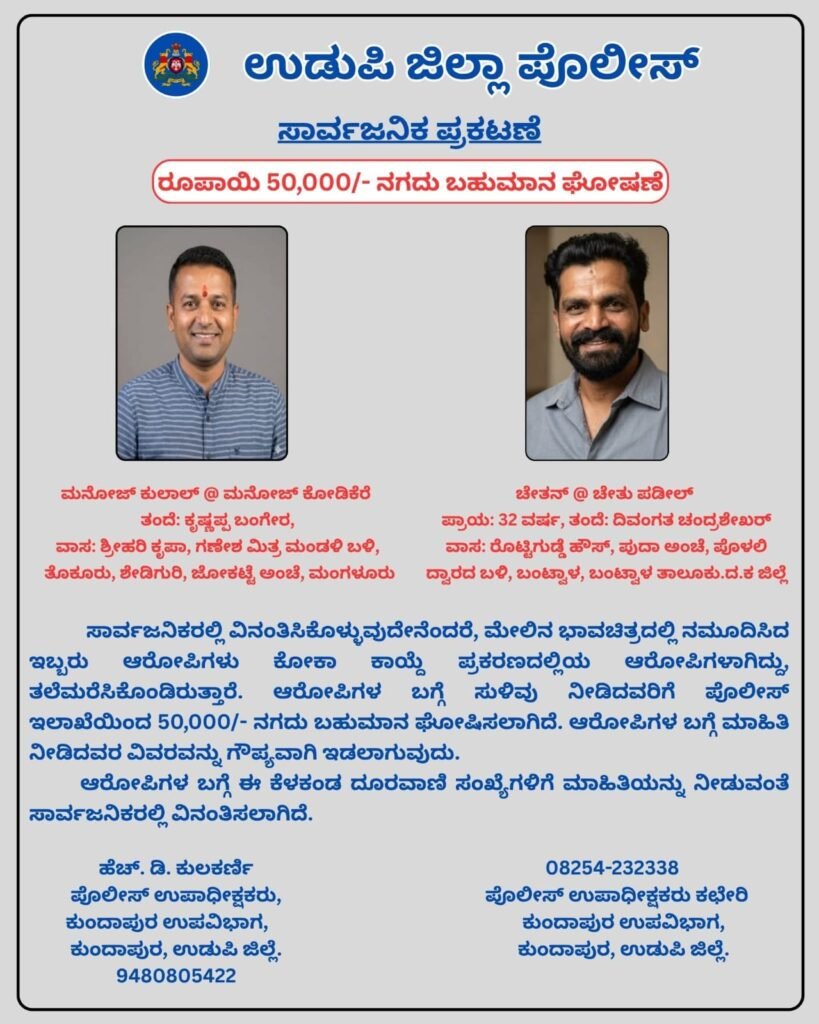 ಪರಾರಿಯಾಗಿರುವ ಆರೋಪಿಗಳ ಬಗ್ಗೆ ಮಾಹಿತಿ ಇದ್ದಲ್ಲಿ ಕುಂದಾಪುರ ಉಪ ವಿಭಾಗದ ಡಿವೈಎಸ್ಪಿ ಹೆಚ್.ಡಿ. ಕುಲಕರ್ಣಿ (ಮೊಬೈಲ್: 9480805422) ಅವರನ್ನು ಸಂಪರ್ಕಿಸಲು ಪೊಲೀಸರು ಮನವಿ ಮಾಡಿದ್ದಾರೆ. ಮಾಹಿತಿ ನೀಡುವವರಿಗೆ 50,000 ನಗದು ಬಹುಮಾನ ಘೋಷಿಸಲಾಗಿದ್ದು, ಮಾಹಿತಿದಾರರ ವಿವರಗಳನ್ನು ಗೌಪ್ಯವಾಗಿಡಲಾಗುವುದು ಎಂದು ತಿಳಿಸಿದ್ದಾರೆ.