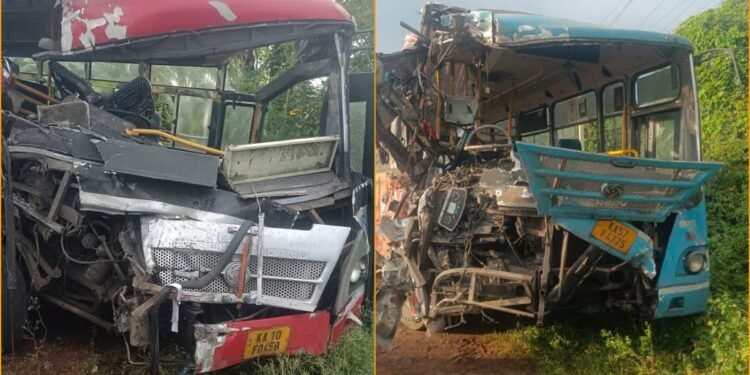 ಎರಡು ಕೆಎಸ್ಆರ್ಟಿಸಿ ಬಸ್ಗಳು ಮುಖಾಮುಖಿಯಾಗಿ ಡಿಕ್ಕಿಯಾಗಿವೆ. ಈ ಘರ್ಷಣೆಯಿಂದಾಗಿ ಮತ್ತೊಂದು ಬಸ್ಗೂ ಡಿಕ್ಕಿಯಾಗಿದ್ದರಿಂದ ಮೂರು ಬಸ್ಗಳ ಪ್ರಯಾಣಿಕರು ಗಾಯಗೊಂಡಿದ್ದಾರೆ. ಡಿಕ್ಕಿಯಾದ ರಭಸಕ್ಕೆ ಮೂರು ಬಸ್ಗಳ ಕೆಲವು ಭಾಗಗಳು ಜಖಂಗೊಂಡಿವೆ.