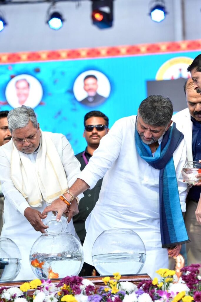 ವಿಶ್ವ ಮೀನುಗಾರಿಕೆ ದಿನಾಚರಣೆ ಹಿನ್ನೆಲೆ ಹೆಬ್ಬಾಳದ ಪಶು ವೈದ್ಯಕೀಯ ಮಹಾವಿದ್ಯಾಲಯದ ಆವರಣದಲ್ಲಿ ನಡೆಯುತ್ತಿರುವ ಮತ್ಸ್ಯಮೇಳ ಕಾರ್ಯಕ್ರಮಕ್ಕೆ ಸಿಎಂ ಹಾಗೂ ಡಿಸಿಎಂ ಒಟ್ಟಿಗೆ ಆಗಮಿಸಿದ್ದಾರೆ. ಅಲ್ಲದೇ ಮತ್ಸ್ಯಮೇಳದ ಸ್ಟಾಲ್ಗಳನ್ನು ಜೊತೆಯಾಗಿ ವೀಕ್ಷಿಸಿದ್ದಾರೆ. ಒಂದೇ ವೇದಿಕೆಯ ಮೇಲೆ ಅಕ್ಕಪಕ್ಕ ಕುಳಿತಿರುವ ಸಿಎಂ-ಡಿಸಿಎಂ ಗುಸುಗುಸು ಮಾತನಾಡಿದ್ದಾರೆ.