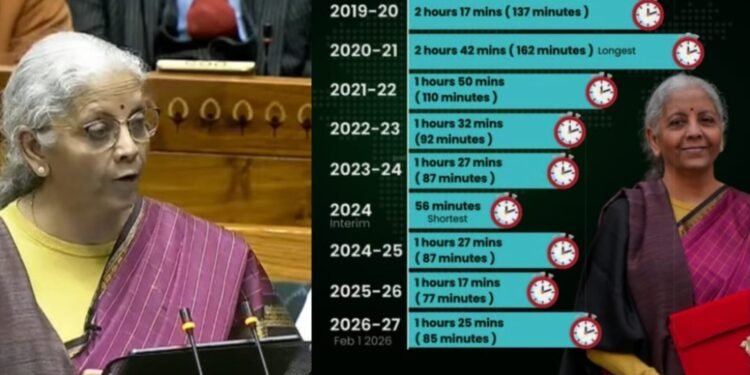 ಇದೇ ವೇಳೆ ಸೀತಾರಾಮನ್ ಅವರು ಈ ಬಾರಿ ಒಟ್ಟು 1 ಗಂಟೆ 25 ನಿಮಿಷಗಳ ಕಾಲ (85 ನಿಮಿಷ) ಬಜೆಟ್ ಭಾಷಣ ಮಾಡಿದ್ದಾರೆ. ಇದು ಅವರ ಒಂಬತ್ತು ಬಜೆಟ್ ಭಾಷಣಗಳ ಪೈಕಿ ಆರನೇ ಸುದೀರ್ಘ ಭಾಷಣವಾಗಿ ದಾಖಲಾಗಿದೆ. ಈ ಅವಧಿಯು 2024ರ ಜುಲೈನಲ್ಲಿ ಅವರು ಮಂಡಿಸಿದ್ದ ಪೂರ್ಣ ಪ್ರಮಾಣದ ಬಜೆಟ್ ಭಾಷಣದ ಅವಧಿಗೆ ಸಮ. ನಿರ್ಮಲಾ ಸೀತಾರಾಮನ್ ಅವರ ವೃತ್ತಿಜೀವನದಲ್ಲೇ 2020ರ ಬಜೆಟ್ ಭಾಷಣವು ಅತಿ ಹೆಚ್ಚು ಅಂದರೆ 162 ನಿಮಿಷಗಳ ಕಾಲ ನಡೆದಿತ್ತು. ಅಲ್ಲಿಂದೀಚೆಗೆ ಅವರ ಭಾಷಣದ ಅವಧಿಯಲ್ಲಿ ಏರಿಳಿತಗಳಾಗುತ್ತಾ ಬಂದಿದ್ದು, ಕಳೆದ ವರ್ಷದ 77 ನಿಮಿಷಗಳಿಗೆ ಹೋಲಿಸಿದರೆ ಈ ಬಾರಿ ಭಾಷಣದ ಸುದೀರ್ಘತೆ ಕೊಂಚ ಹೆಚ್ಚಾಗಿದೆ.