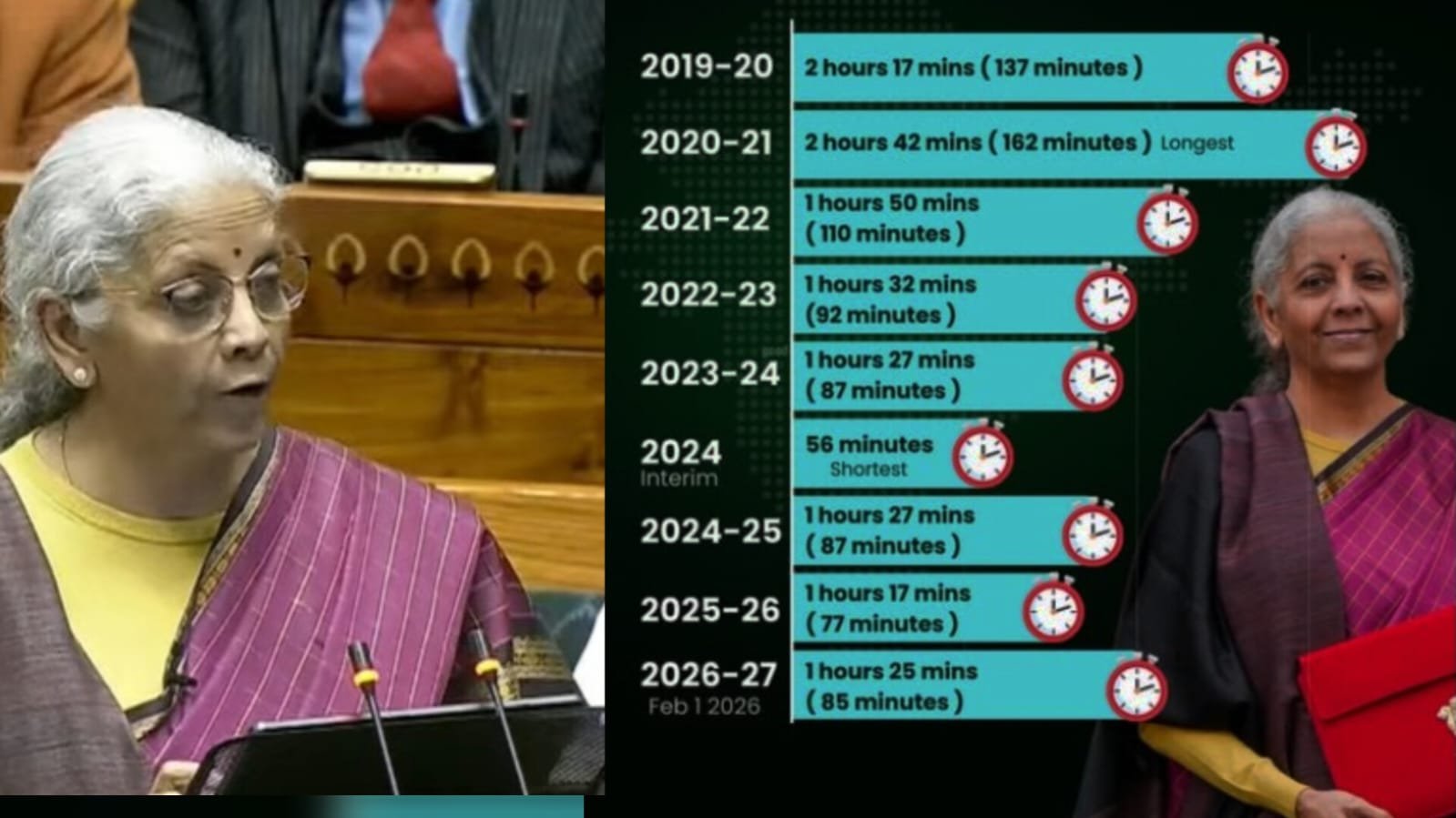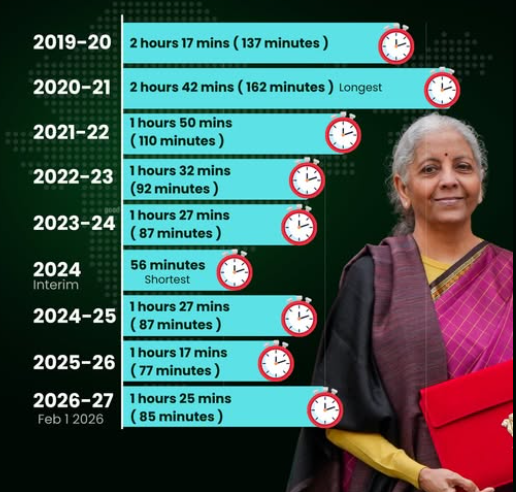 ಇದೇ ವೇಳೆ ಸೀತಾರಾಮನ್ ಅವರು ಈ ಬಾರಿ ಒಟ್ಟು 1 ಗಂಟೆ 25 ನಿಮಿಷಗಳ ಕಾಲ (85 ನಿಮಿಷ) ಬಜೆಟ್ ಭಾಷಣ ಮಾಡಿದ್ದಾರೆ. ಇದು ಅವರ ಒಂಬತ್ತು ಬಜೆಟ್ ಭಾಷಣಗಳ ಪೈಕಿ ಆರನೇ ಸುದೀರ್ಘ ಭಾಷಣವಾಗಿ ದಾಖಲಾಗಿದೆ. ಈ ಅವಧಿಯು 2024ರ ಜುಲೈನಲ್ಲಿ ಅವರು ಮಂಡಿಸಿದ್ದ ಪೂರ್ಣ ಪ್ರಮಾಣದ ಬಜೆಟ್ ಭಾಷಣದ ಅವಧಿಗೆ ಸಮ. ನಿರ್ಮಲಾ ಸೀತಾರಾಮನ್ ಅವರ ವೃತ್ತಿಜೀವನದಲ್ಲೇ 2020ರ ಬಜೆಟ್ ಭಾಷಣವು ಅತಿ ಹೆಚ್ಚು ಅಂದರೆ 162 ನಿಮಿಷಗಳ ಕಾಲ ನಡೆದಿತ್ತು. ಅಲ್ಲಿಂದೀಚೆಗೆ ಅವರ ಭಾಷಣದ ಅವಧಿಯಲ್ಲಿ ಏರಿಳಿತಗಳಾಗುತ್ತಾ ಬಂದಿದ್ದು, ಕಳೆದ ವರ್ಷದ 77 ನಿಮಿಷಗಳಿಗೆ ಹೋಲಿಸಿದರೆ ಈ ಬಾರಿ ಭಾಷಣದ ಸುದೀರ್ಘತೆ ಕೊಂಚ ಹೆಚ್ಚಾಗಿದೆ.