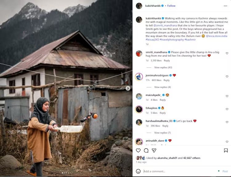 ಈ ಬಗ್ಗೆ ಇನ್ಸ್ಟಾಗ್ರಾಮ್ನಲ್ಲಿ ಬರೆದುಕೊಂಡಿದ್ದ ಕಬೀರ್ ಖಾನ್, “ಕಾಶ್ಮೀರದಲ್ಲಿ ನನ್ನ ಕ್ಯಾಮೆರಾದೊಂದಿಗೆ ಓಡಾಡುವಾಗ ಇಂತಹ ಮಾಂತ್ರಿಕ ಕ್ಷಣಗಳು ಸಿಗುತ್ತವೆ. ಅರು ಕಣಿವೆಯ ಈ ಪುಟ್ಟ ಹುಡುಗಿ ಸ್ಮೃತಿ ಮಂಧಾನ ಅವರ ಅಭಿಮಾನಿ. ಈ ಪೋಸ್ಟ್ ಸ್ಮೃತಿ ಅವರಿಗೆ ತಲುಪುತ್ತದೆ ಎಂದು ಭಾವಿಸುತ್ತೇನೆ,” ಎಂದು ಬಾಲಕಿಯ ಫೋಟೋ ಸಮೇತ ಪೋಸ್ಟ್ ಮಾಡಿದ್ದರು.
