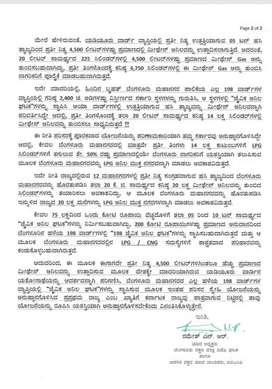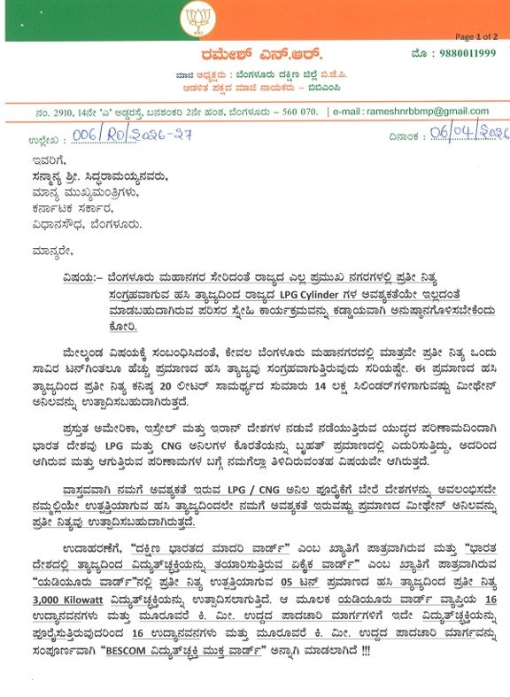 ಪ್ರಸ್ತುತ ಅಮೆರಿಕ, ಇಸ್ರೇಲ್ ಮತ್ತು ಇರಾನ್ ದೇಶಗಳ ನಡುವೆ ನಡೆಯುತ್ತಿರುವ ಯುದ್ಧದ ಪರಿಣಾಮದಿಂದಾಗಿ ಭಾರತ ದೇಶವು LPG ಮತ್ತು CNG ಅನಿಲಗಳ ಕೊರತೆಯನ್ನು ಬೃಹತ್ ಪ್ರಮಾಣದಲ್ಲಿ ಎದುರಿಸುತ್ತಿದ್ದು, ಅದರಿಂದ ಆಗಿರುವ ಮತ್ತು ಆಗುತ್ತಿರುವ ಪರಿಣಾಮಗಳ ಬಗ್ಗೆ ನಮಗೆಲ್ಲಾ ತಿಳಿದಿರುವ ವಿಷಯವೇ ಆಗಿದೆ. ವಾಸ್ತವವಾಗಿ ನಮಗೆ ಅವಶ್ಯಕತೆ ಇರುವ LPG/CNG ಅನಿಲ ಪೂರೈಕೆಗೆ ಬೇರೆ ದೇಶಗಳನ್ನು ಅವಲಂಭಿಸದೇ ನಮ್ಮಲ್ಲಿಯೇ ಉತ್ಪತ್ತಿಯಾಗುವ ಹಸಿ ತ್ಯಾಜ್ಯದಿಂದಲೇ ನಮಗೆ ಅವಶ್ಯಕತೆ ಇರುವಷ್ಟು ಪ್ರಮಾಣದ ಮೀಥೇನ್ ಅನಿಲವನ್ನು ಪ್ರತಿನಿತ್ಯವು ಉತ್ಪಾದಿಸಬಹುದಾಗಿದೆ ಎಂದು ಎನ್‌.ಆರ್‌ ರಮೇಶ್ ಪತ್ರದಲ್ಲಿ ತಿಳಿಸಿದ್ದಾರೆ.