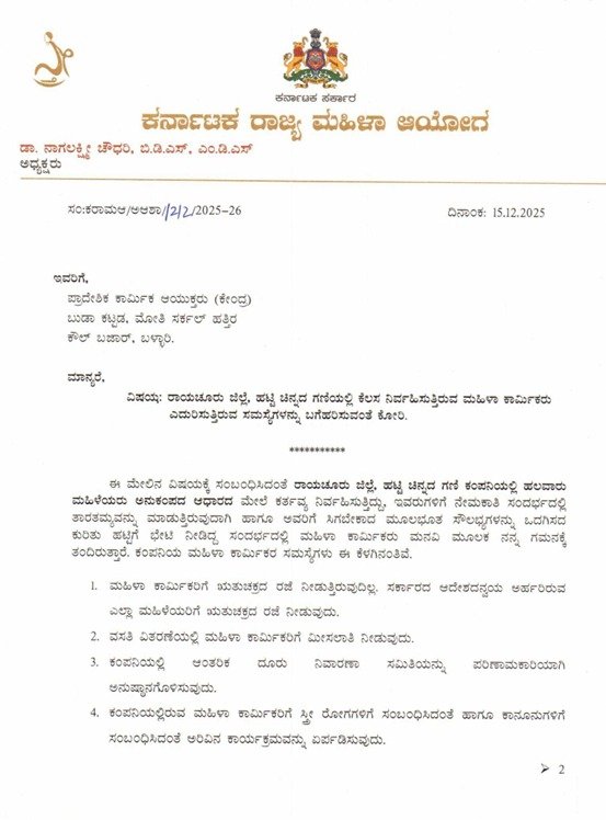 ಬೆಂಗಳೂರು\ರಾಯಚೂರು : ರಾಯಚೂರು ಜಿಲ್ಲೆಯ ಹಟ್ಟಿ ಚಿನ್ನದ ಗಣಿಯಲ್ಲಿ ಕೆಲಸ ನಿರ್ವಹಿಸುತ್ತಿರುವ ಮಹಿಳಾ ಕಾರ್ಮಿಕರು ಎದುರಿಸುತ್ತಿರುವ ಸಮಸ್ಯೆಗಳನ್ನು ಬಗೆಹರಿಸುವಂತೆ ಕೋರಿ ರಾಜ್ಯ ಮಹಿಳಾ ಆಯೋಗದ ಅಧ್ಯಕ್ಷೆ ಡಾ. ನಾಗಲಕ್ಷ್ಮೀ ಚೌಧರಿ ಅವರು ಪ್ರಾದೇಶಿಕ ಕಾರ್ಮಿಕ ಆಯುಕ್ತರಿಗೆ ಪತ್ರ ಬರೆದಿದ್ದಾರೆ.