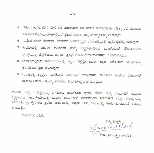 - ಮಹಿಳಾ ಕಾರ್ಮಿಕರಿಗೆ ಋತುಚಕ್ರದ ರಜೆ ನೀಡುತ್ತಿರುವುದಿಲ್ಲ. ಸರ್ಕಾರದ ಆದೇಶದನ್ವಯ ಅರ್ಹರಿರುವ ಎಲ್ಲಾ ಮಹಿಳೆಯರಿಗೆ ಋತುಚಕ್ರದ ರಜೆ ನೀಡುವುದು.