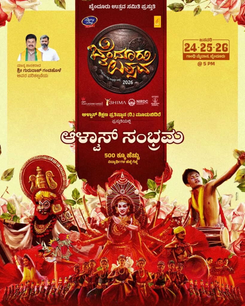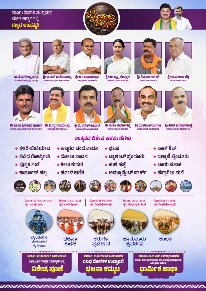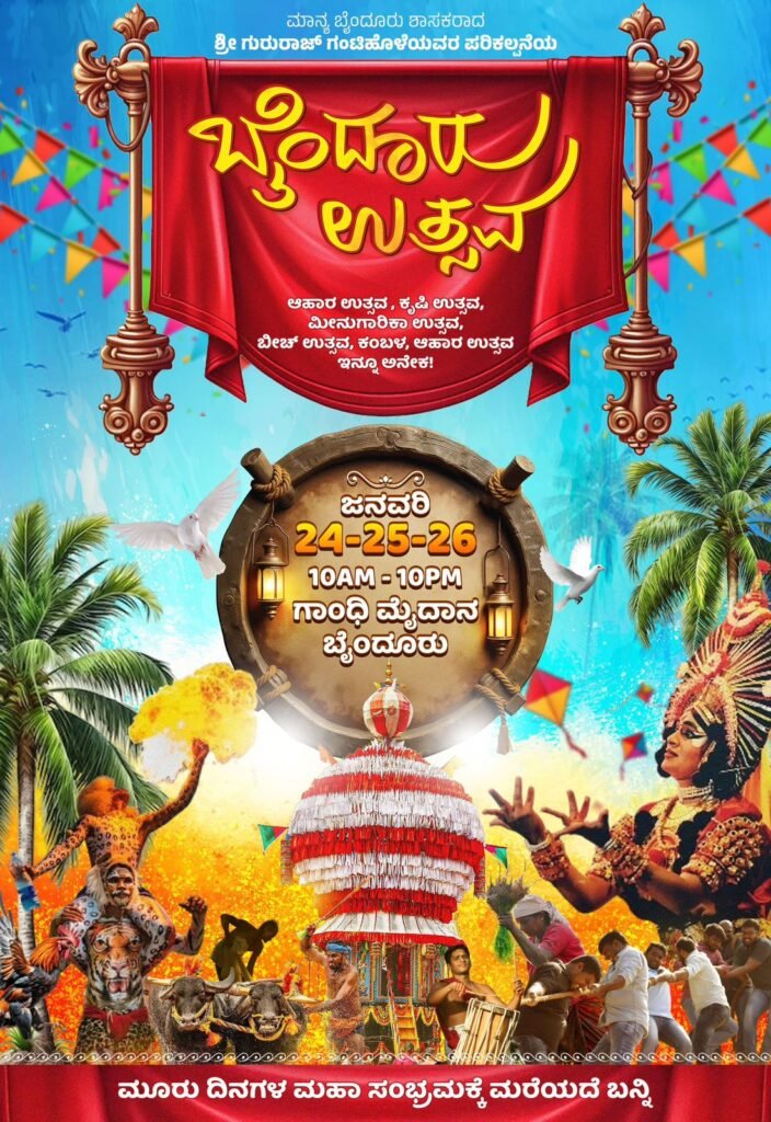ಬೈಂದೂರು: ಬೈಂದೂರು ಉತ್ಸವ ಸಮಿತಿ ಇವರ ವತಿಯಿಂದ ಹಾಗೂ ಶಾಸಕ ಗುರುರಾಜ್ ಗಂಟಿಹೊಳೆ ಅವರ ಪರಿಕಲ್ಪನೆಯಲ್ಲಿ ಜನವರಿ 24, 25 ಹಾಗೂ 26ರಂದು ನಗರದ ಗಾಂಧಿ ಮೈದಾನದಲ್ಲಿ ಅದ್ಧೂರಿಯಾಗಿ ಎರಡನೇ ವರ್ಷದ ‘ಬೈಂದೂರು ಉತ್ಸವ-2026’ ಕಾರ್ಯಕ್ರಮವು ನಡೆಯಲಿದೆ.