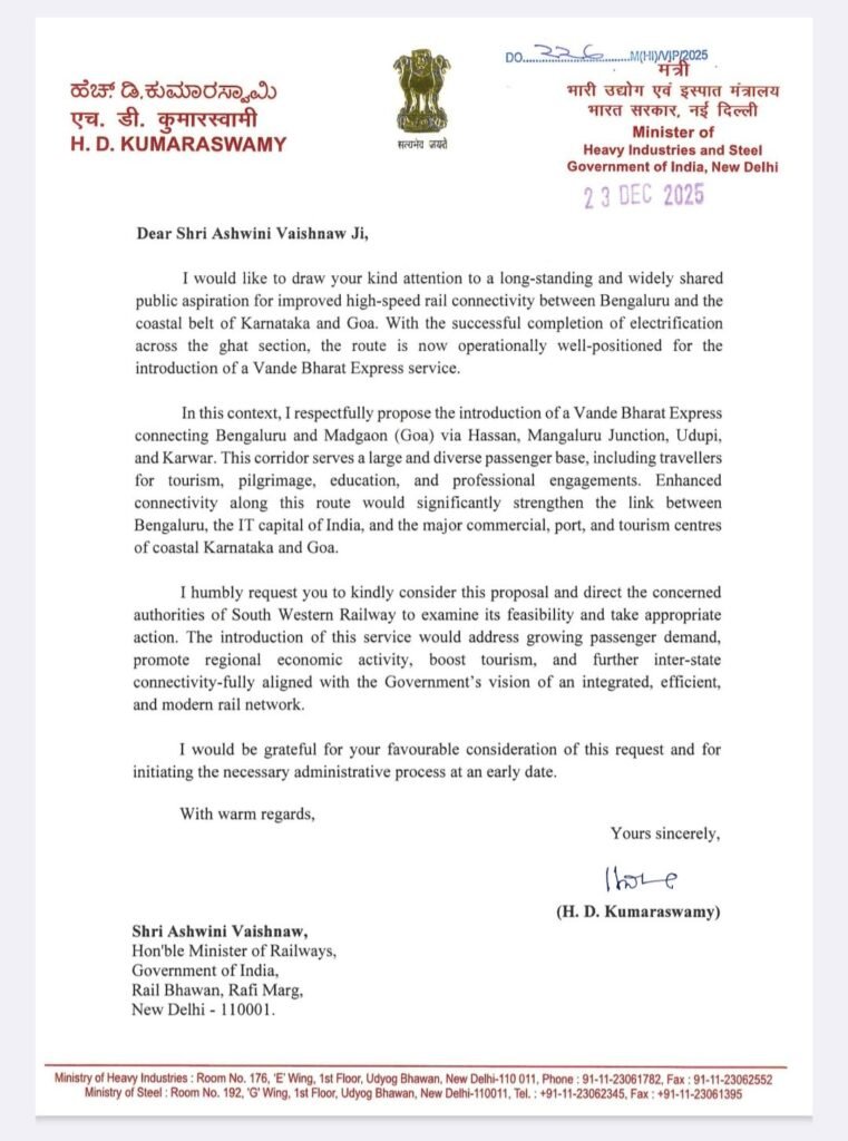 ಈ ಹಿನ್ನೆಲೆಯಲ್ಲಿ ಮನವಿಯನ್ನು ಪರಿಗಣಿಸಿ ವಂದೇ ಭಾರತ್ ರೈಲು ಸೇವೆ ಆರಂಭಿಸುವ ಸಾಧ್ಯಾಸಾಧ್ಯತೆಗಳನ್ನು ಪರಿಶೀಲಿಸಿ ಅಗತ್ಯ ಕ್ರಮಗಳನ್ನು ಕೈಗೊಳ್ಳಲು ನೈರುತ್ಯ ರೈಲ್ವೆಯ ಸಂಬಂಧಿಸಿದ ಅಧಿಕಾರಿಗಳಿಗೆ ನಿರ್ದೇಶನ ನೀಡುವಂತೆ ರೈಲ್ವೆ ಸಚಿವರಿಗೆ ಕುಮಾರಸ್ವಾಮಿ ಮನವಿ ಮಾಡಿದ್ದಾರೆ.