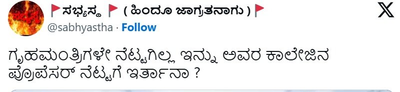ಬೆಂಗಳೂರು : ಗೃಹಸಚಿವರೇ ನೆಟ್ಟಗಿಲ್ಲ, ಅವರ ಕಾಲೇಜಿನ ಪ್ರೊಫೆಸರ್ ನೆಟ್ಟಗಿರ್ತಾನಾ? ಎಂದು ಎಕ್ಸ್ ಖಾತೆ ಮೂಲಕ ಗೃಹ ಸಚಿವ ಡಾ. ಜಿ. ಪರಮೆಶ್ವರ್ ಕುರಿತು ಆಕ್ಷೇಪಾರ್ಹ ಪೋಸ್ಟ್ ಸಂಬಂಧ ಬೆಂಗಳೂರಿನ ಸೈಬರ್ ಕ್ರೈಂ ಠಾಣೆಯಲ್ಲಿ ಸುಮೋಟೋ ಕೇಸ್ ದಾಖಲಾಗಿದೆ.