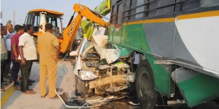ಚಿತ್ತೂರು : ನಿಂತಿದ್ದ ಎಪಿಎಸ್ಆರ್ಟಿಸಿ ಬಸ್ಗೆ ಹಿಂಬದಿಯಿಂದ ಕಾರು ಡಿಕ್ಕಿ ಹೊಡೆದ ಪರಿಣಾಮ ಮೂವರು ಸ್ಥಳದಲ್ಲೇ ಸಾವನ್ನಪ್ಪಿದ್ದು, ಮತ್ತೊರ್ವನಿಗೆ ಗಂಭೀರ ಗಾಯವಾಗಿರುವ ಘಟನೆ ಆಂದ್ರದ ಚಿತ್ತೂರು ಬಳಿಯ ಶೇಷಪುರಂನಲ್ಲಿ ನಡೆದಿದೆ.