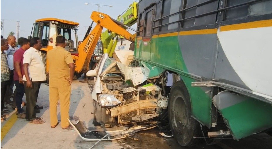 ಚಿತ್ತೂರು : ನಿಂತಿದ್ದ ಎಪಿಎಸ್ಆರ್ಟಿಸಿ ಬಸ್ಗೆ ಹಿಂಬದಿಯಿಂದ ಕಾರು ಡಿಕ್ಕಿ ಹೊಡೆದ ಪರಿಣಾಮ ಮೂವರು ಸ್ಥಳದಲ್ಲೇ ಸಾವನ್ನಪ್ಪಿದ್ದು, ಮತ್ತೊರ್ವನಿಗೆ ಗಂಭೀರ ಗಾಯವಾಗಿರುವ ಘಟನೆ ಆಂದ್ರದ ಚಿತ್ತೂರು ಬಳಿಯ ಶೇಷಪುರಂನಲ್ಲಿ ನಡೆದಿದೆ.
