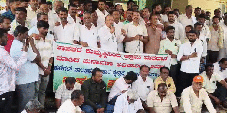 ತುಮಕೂರು: ಸಂತೆಮಾವತ್ತೂರು ವಿಎಸ್ಎಸ್‌ಎನ್ ಅಕ್ರಮ ಚುನಾವಣೆಯ ಆರೋಪ ದಿನೇ ದಿನೇ ತೀವ್ರವಾಗುತ್ತಿದ್ದು, ಕುಣಿಗಲ್ ಪಟ್ಟಣದಲ್ಲಿ ಬೃಹತ್ ಪ್ರತಿಭಟನೆ ನಡೆಯಿತು. ಕುಣಿಗಲ್ ಶಾಸಕ ಡಾ. ರಂಗನಾಥ್ ವಿರುದ್ಧ ಆಕ್ರೋಶ ವ್ಯಕ್ತಪಡಿಸಿದ ಬಿಜೆಪಿ ಹಾಗೂ ಜೆಡಿಎಸ್ ಕಾರ್ಯಕರ್ತರು, ಚುನಾವಣಾ ಅಕ್ರಮ ತಡೆದವರ ಮೇಲೆ ಸುಳ್ಳು ಪ್ರಕರಣ ದಾಖಲಿಸಲಾಗಿದೆ ಎಂದು ಆರೋಪಿಸಿದ್ದಾರೆ.