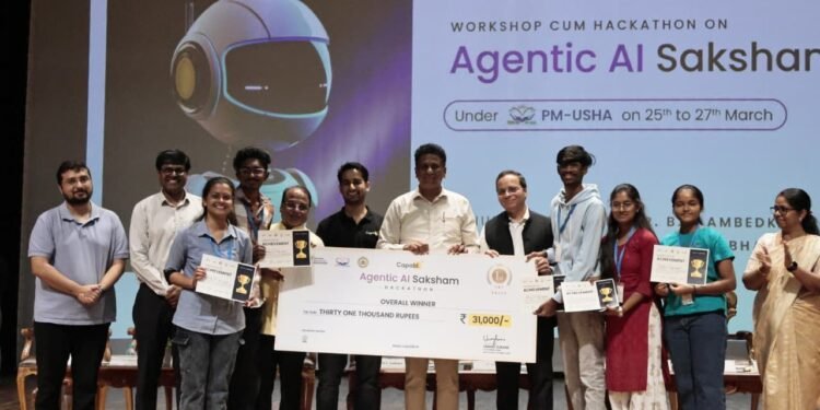 ಏಜೆಂಟಿಕ್ ಎಐ ಸಕ್ಷಮ್ ಹ್ಯಾಕಾಥಾನ್ನಲ್ಲಿ 90 ಕ್ಕೂ ಅಧಿಕ ತಂಡಗಳು ನೊಂದಣಿಯಾಗಿದ್ದು ಬೆಂಗಳೂರು ನಗರ ವಿಶ್ವವಿದ್ಯಾಲಯ ವಿದ್ಯಾರ್ಥಿಗಳ ತಂಡ ಮೊದಲ ಸ್ಥಾನ ಪಡೆದಿದ್ದು ನಗದು ಬಹುಮಾನ ನೀಡಿ ಸನ್ಮಾನಿಸಲಾಯಿತು.