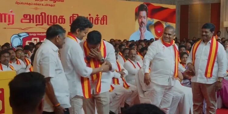 ಚೆನ್ನೈ: ತಮಿಳಗ ವೆಟ್ರಿ ಕಳಗಂ (TVK) ಪಕ್ಷದ ಸಂಸ್ಥಾಪಕ ಹಾಗೂ ನಟ ವಿಜಯ್ ಅವರು ತಮಿಳುನಾಡು ರಾಜಕೀಯದಲ್ಲಿ ಹೊಸ ಅಲೆ ಎಬ್ಬಿಸಿದ್ದಾರೆ. ಇದೀಗ ತಮ್ಮ ಪಕ್ಷದ ಅಭ್ಯರ್ಥಿಗಳ ಪರಿಚಯಾತ್ಮಕ ಕಾರ್ಯಕ್ರಮದಲ್ಲಿ, ವಿಲ್ಲಿವಾಕ್ಕಂ ಕ್ಷೇತ್ರದ ಅಭ್ಯರ್ಥಿ ಶಬರಿನಾಥನ್ ಅವರ ಹೆಸರನ್ನು ವಿಜಯ್ ಘೋಷಿಸಿದಾಗ, ವೇದಿಕೆಯ ಮೇಲೆ ಕಂಡುಬಂದ ದೃಶ್ಯಗಳು ಈಗ ತಮಿಳುನಾಡಿನಾದ್ಯಂತ ಸಂಚಲನ ಮೂಡಿಸಿವೆ.