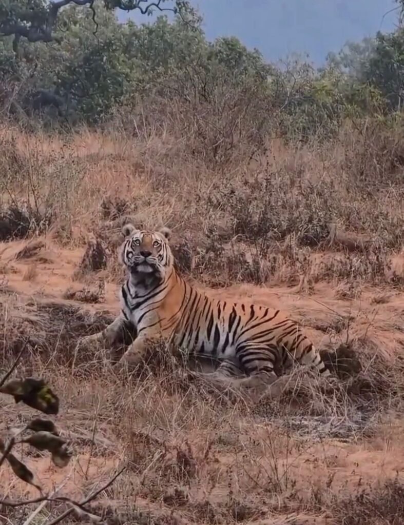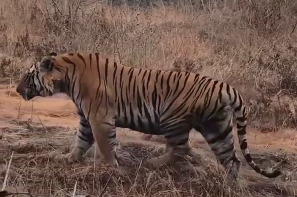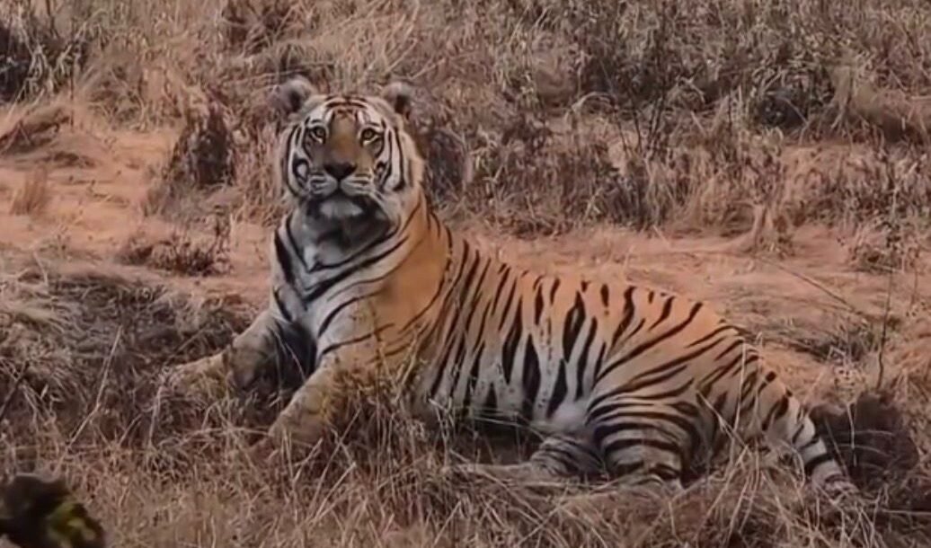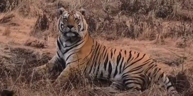 ಚಿಕ್ಕಮಗಳೂರು ಜಿಲ್ಲೆಯ ತರೀಕೆರೆ ತಾಲೂಕಿನ ಕೆಮ್ಮಣ್ಣುಗುಂಡಿ ಸಮೀಪದ ತಣಿಗೆಬೈಲ್ ಅರಣ್ಯ ವಲಯ ವ್ಯಾಪ್ತಿಯಲ್ಲಿ ಈ ಘಟನೆ ನಡೆದಿದೆ. ಪ್ರವಾಸಿಗರು ವಾಹನದಲ್ಲಿ ತೆರಳುತ್ತಿದ್ದಾಗ ಅರಣ್ಯದ ಅಂಚಿನಲ್ಲಿ ಹುಲಿಯೊಂದು ಯಾವುದೇ ಅಂಜಿಕೆಯಿಲ್ಲದೆ ಆರಾಮವಾಗಿ ಕುಳಿತಿರುವುದು ಕಂಡುಬಂದಿದೆ. ವಿಡಿಯೋ ಚಿತ್ರೀಕರಿಸುತ್ತಿದ್ದ ಪ್ರವಾಸಿಗರಿಗೂ ಹುಲಿ ದಿಟ್ಟವಾಗಿ ‘ಲುಕ್’ ಕೊಟ್ಟಿದೆ.