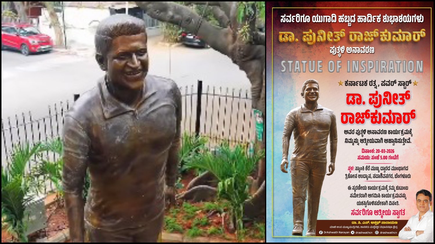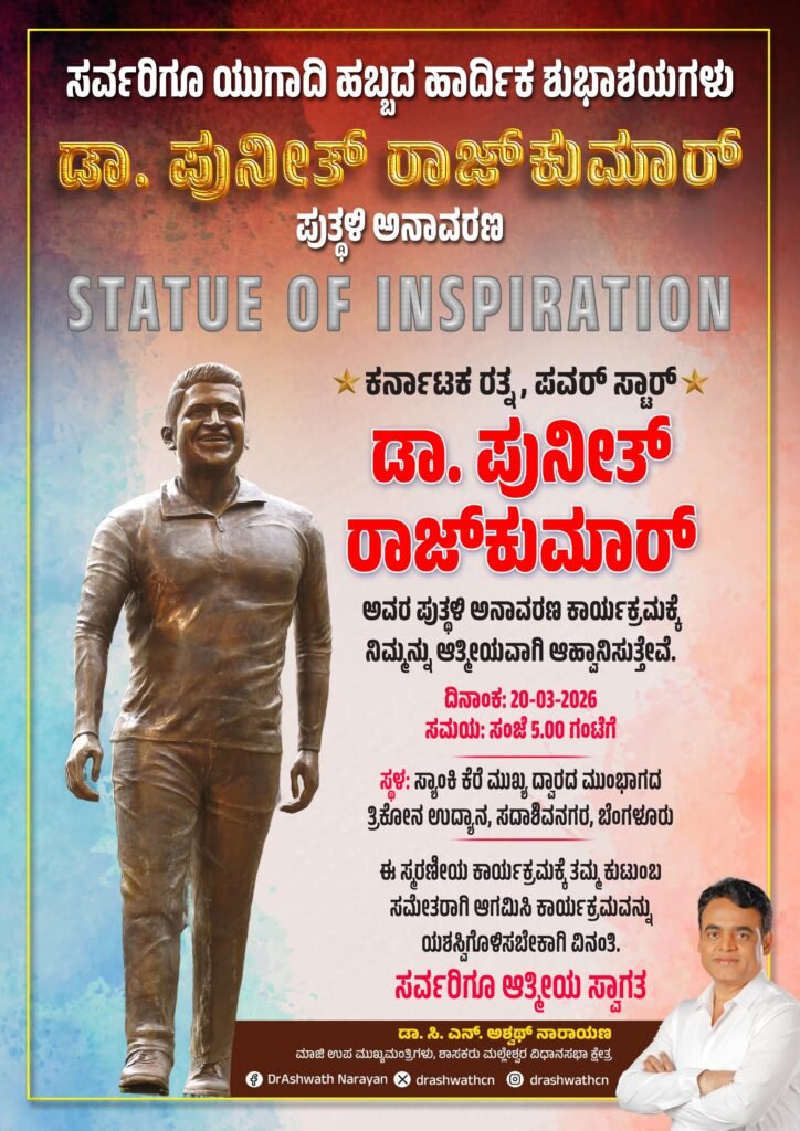 ಬೆಂಗಳೂರು : ಕರ್ನಾಟಕ ರತ್ನ ಡಾ. ಪುನೀತ್ ರಾಜ್ಕುಮಾರ್ ಅವರ ಸ್ಮರಣಾರ್ಥವಾಗಿ ಸರ್ವರಿಗೂ ಪ್ರೇರಣೆಯಾಗುವ ಕಾರ್ಯಕ್ರಮವನ್ನು ನಗರದ ಮಲ್ಲೇಶ್ವರಂನಲ್ಲಿ ಆಯೋಜಿಸಲಾಗಿದೆ. ಮಾಜಿ ಉಪಮುಖ್ಯಮಂತ್ರಿ, ಮಲ್ಲೇಶ್ವರಂನ ಬಿಜೆಪಿ ಶಾಸಕ ಡಾ ಸಿ.ಎನ್ ಅಶ್ವಥ್ ನಾರಾಯಣ್ ಅವರ ನೇತೃತ್ವದಲ್ಲಿ “ಸ್ಟ್ಯಾಚ್ಯೂ ಆಫ್ ಇನ್ಸ್ಪಿರೇಶನ್” ಎಂಬ ಹೆಸರಿನಲ್ಲಿ ದಿ. ನಟ ಪುನೀತ್ ರಾಜ್ಕುಮಾರ್ ಅವರ ಪುತ್ಥಳಿ ನಾಳೆ (ಮಾರ್ಚ್ 20) ಅನಾವರಣಗೊಳ್ಳಲಿದೆ.