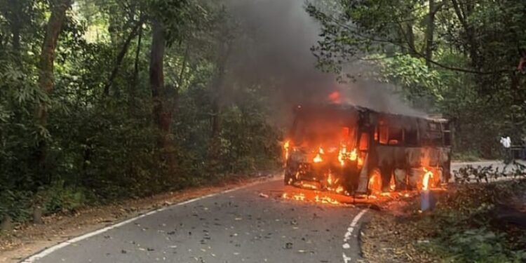 ಮಡಿಕೇರಿ: ಪ್ರವಾಸಿ ಬಸ್ಸೊಂದು ನಡು ರಸ್ತೆಯಲ್ಲೇ ಹೊತ್ತಿ ಉರಿದ ಘಟನೆ ವಿರಾಜಪೇಟೆಯ ಮಾಕುಟ್ಟ ಬಳಿಯ ಮಗಡಿಪಾರೆ ಆಂಜನೇಯ ದೇವಾಲಯದ ಬಳಿ ನಡೆದಿದೆ.