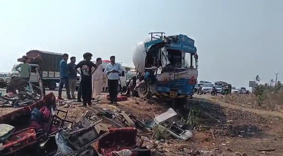 ಉಡುಪಿ : ಜಿಲ್ಲೆಯ ಪ್ರಸಿದ್ದ ಪ್ರವಾಸಿ ತಾಣವಾದ ಮರವಂತೆ ಬೀಚ್ ಮುಂಭಾಗದ ರಾಷ್ಟ್ರೀಯ ಹೆದ್ದಾರಿ 66ರಲ್ಲಿ ಇಂದು ಮಧ್ಯಾಹ್ನ ಭೀಕರ ರಸ್ತೆ ಅಪಘಾತ ಸಂಭವಿಸಿದೆ. ಪ್ರವಾಸಿಗರಿದ್ದ ಬಸ್ ರಸ್ತೆ ಬದಿಯಲ್ಲಿ ನಿಂತಿದ್ದ ಟ್ಯಾಂಕರ್​​​ಗೆ ಮೊದಲು ಡಿಕ್ಕಿ ಹೊಡೆದು ನಂತರ ಟ್ರಕ್​​​ಗೆ  ಅತಿ ವೇಗವಾಗಿ ಡಿಕ್ಕಿ ಹೊಡೆದ ಪರಿಣಾಮ ಇಬ್ಬರು ಸಾವನ್ನಪ್ಪಿದ್ದು, ಹಲವರು ಗಂಭೀರವಾಗಿ ಗಾಯಗೊಂಡಿದ್ದಾರೆ.