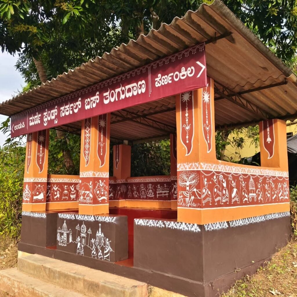 ಉಡುಪಿ: ಉಡುಪಿ ತಾಲೂಕು ಮಣಿಪುರ ಗ್ರಾ.ಪಂ. ವ್ಯಾಪ್ತಿಯ ಮರ್ಣಿ ಗ್ರಾಮದಲ್ಲಿ ಬಸ್ ತಂಗುದಾಣವೊಂದು ಆಕರ್ಷಕ ಚಿತ್ತಾರಗಳಿಂದ ಗಮನ ಸೆಳೆಯುತ್ತಿದೆ. ಬಹಳಷ್ಟು ಸ್ವಚ್ಛತೆಯಿಂದ ಕೂಡಿದ್ದು, ತುಳುನಾಡ ಸಂಪ್ರದಾಯ ಸಂಸ್ಕೃತಿಯನ್ನು ಬಿಂಬಿಸುವ ವರ್ಲಿ ಚಿತ್ತಾರವು ಮನಸೂರೆಗೊಳ್ಳುತ್ತಿದೆ.