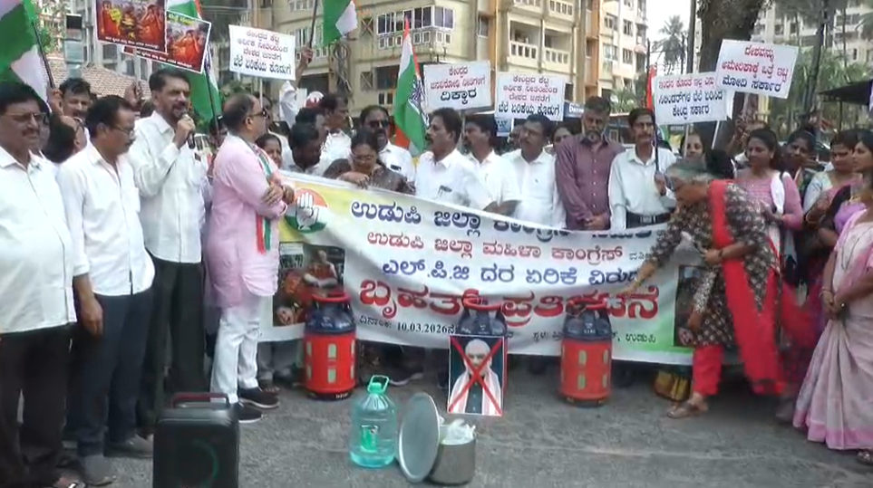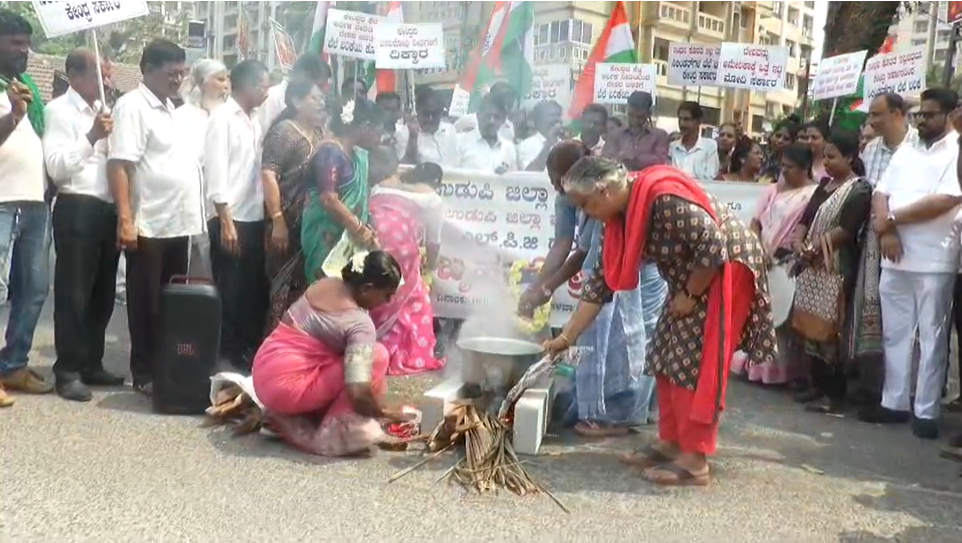 ಉಡುಪಿ: ಅಡುಗೆ ಹಾಗೂ ವಾಣಿಜ್ಯ ಗ್ಯಾಸ್ ಸಿಲಿಂಡರ್ ದರ ಏರಿಕೆ ಖಂಡಿಸಿ ಉಡುಪಿ ಜಿಲ್ಲಾ ಕಾಂಗ್ರೆಸ್ ವತಿಯಿಂದ ವಿನೂತನ ಪ್ರತಿಭಟನೆ ನಡೆದಿದೆ. ಪ್ರತಿಭಟನಾಕಾರರು ಜಿಲ್ಲಾ ಕಾಂಗ್ರೆಸ್ ಭವನದಿಂದ ಪ್ರತಿಭಟನಾ ಮೆರವಣಿಗೆ ನಡೆಸಿ ಬ್ರಹ್ಮಗಿರಿ ಸರ್ಕಲ್ ವರೆಗೆ ಪ್ರತಿಭಟನಾ ಮೆರವಣಿಗೆ ಮಾಡಿದ್ದಾರೆ.