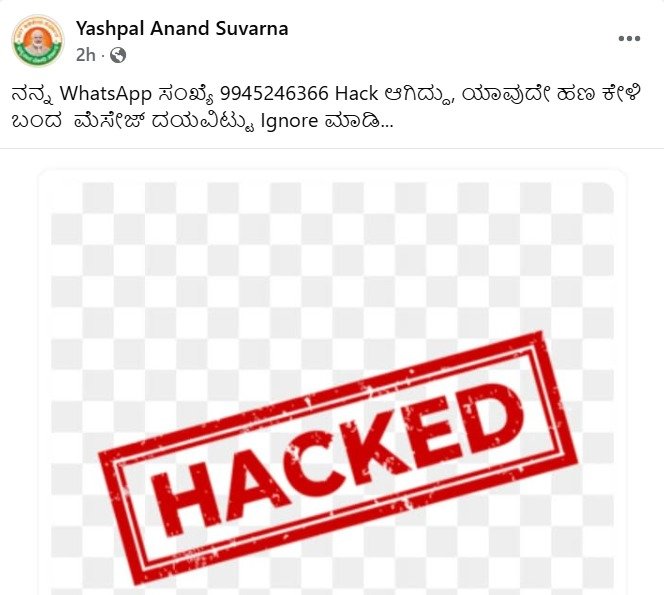 ಶಾಸಕ ಯಶ್‌ಪಾಲ್ ಸುವರ್ಣ ಅವರ ವಾಟ್ಸಾಪ್ ಖಾತೆಯನ್ನು ಹ್ಯಾಕ್ ಮಾಡಿರುವ ಹ್ಯಾಕರ್ಸ್‌ಗಳು, ಶಾಸಕರ ಕಾಂಟ್ಯಾಕ್ಟ್ ಲಿಸ್ಟ್‌ನಲ್ಲಿರುವ ಹಲವು ವ್ಯಕ್ತಿಗಳಿಗೆ ಗೂಗಲ್ ಪೇ ಮೂಲಕ ತುರ್ತಾಗಿ ಹಣ ಕಳುಹಿಸುವಂತೆ ಸಂದೇಶ ರವಾನಿಸುತ್ತಿದ್ದಾರೆ.