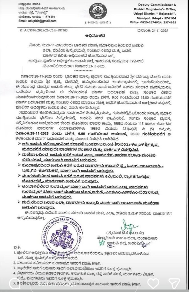 ಉಡುಪಿ : ಶ್ರೀಕೃಷ್ಣ ಮಠದ ಪರ್ಯಾಯ ಪುತ್ತಿಗೆ ಮಠದ ವತಿಯಿಂದ ನಡೆಯಲಿರುವ ಬೃಹತ್ ಗೀತೋತ್ಸವದ ನಿಮಿತ್ತ ನಡೆಯುವ ಲಕ್ಷಕಂಠ ಗೀತಾ ಪಾರಾಯಣದಲ್ಲಿ ಭಾಗಿಯಾಗಲು ಪ್ರಧಾನಿ ನರೇಂದ್ರ ಮೋದಿ ನ.28ರಂದು ಉಡುಪಿಗೆ ಆಗಮಿಸುತ್ತಿರುವ ಹಿನ್ನಲೆಯಲ್ಲಿ ನಗರದಲ್ಲಿ ಮಾರ್ಗ ಬದಲಾವಣೆ ಮತ್ತು ಸಂಚಾರ ನಿಷೇಧಿಸಿ ಜಿಲ್ಲಾಡಳಿತ ಆದೇಶ ಹೊರಡಿಸಿದೆ.