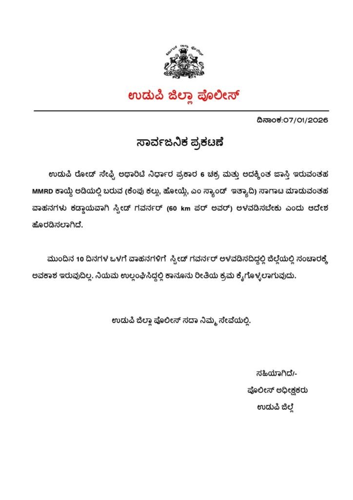 ಆರು ಚಕ್ರ ಮತ್ತು ಅದಕ್ಕಿಂತ ಹೆಚ್ಚಿನ ಚಕ್ರಗಳನ್ನು ಹೊಂದಿರುವ ಮರಳು, ಕೆಂಪುಕಲ್ಲು ಮತ್ತಿತರ ಸಾಮಗ್ರಿ ಸಾಗಾಟದ ವಾಹನಗಳು ಇನ್ನು ಮುಂದೆ ಕಡ್ಡಾಯವಾಗಿ ವೇಗ ನಿಯಂತ್ರಕ ಅಳವಡಿಸಬೇಕು ಎಂದು ಸೂಚನೆ ನೀಡಲಾಗಿದೆ.ಅಲ್ಲದೇ ರಸ್ತೆ ಸುರಕ್ಷತಾ ಪ್ರಾಧಿಕಾರದ ಸಭೆಯಲ್ಲಿ ಈ ನಿರ್ಣಯ ಕೈಗೊಳ್ಳಲಾಗಿದೆ ಎಂದು ಉಡುಪಿ ಎಸ್‌ಪಿ ಹರಿರಾಂ ಶಂಕ‌ರ್ ಅವರು ತಿಳಿಸಿದ್ದಾರೆ.