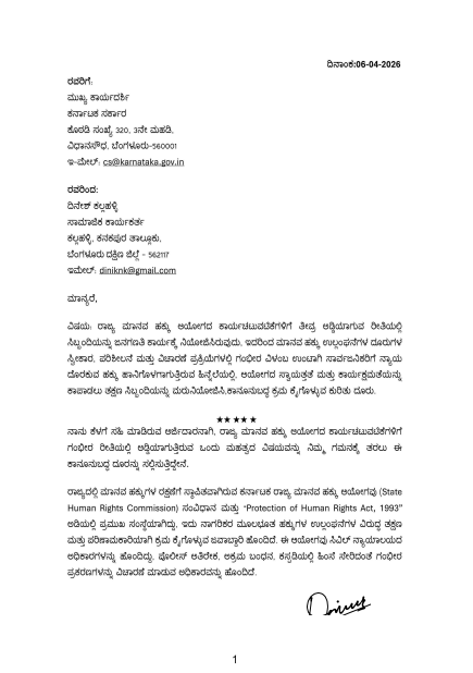 ಸಂವಿಧಾನ ಮತ್ತು ‘Protection of Human Rights Act, 1993’ ಅಡಿಯಲ್ಲಿ ಕಾರ್ಯನಿರ್ವಹಿಸುವ ಈ ಆಯೋಗವು ಪೊಲೀಸ್ ಅತಿರೇಕ, ಅಕ್ರಮ ಬಂಧನ, ಕಸ್ಟಡಿಯಲ್ಲಿ ಹಿಂಸೆ ಸೇರಿದಂತೆ ಗಂಭೀರ ಮಾನವ ಹಕ್ಕು ಉಲ್ಲಂಘನೆ ಪ್ರಕರಣಗಳನ್ನು ವಿಚಾರಣೆ ಮಾಡುವ ಮಹತ್ವದ ಜವಾಬ್ದಾರಿಯನ್ನು ಹೊಂದಿದೆ. ಸಿವಿಲ್ ನ್ಯಾಯಾಲಯದ ಅಧಿಕಾರಗಳನ್ನು ಹೊಂದಿರುವ ಆಯೋಗವು ತ್ವರಿತ ಕ್ರಮ ಕೈಗೊಳ್ಳಬೇಕಾದ ಸಂದರ್ಭಗಳಲ್ಲಿ ಈಗ ನಿರ್ಜೀವ ಸ್ಥಿತಿಗೆ ತಲುಪಿರುವುದು ಕಳವಳಕಾರಿ ಬೆಳವಣಿಗೆಯಾಗಿದೆ ಎಂದು ದಿನೇಶ್ ಕಲ್ಲಹಳ್ಳಿ ತಿಳಿಸಿದ್ದಾರೆ.