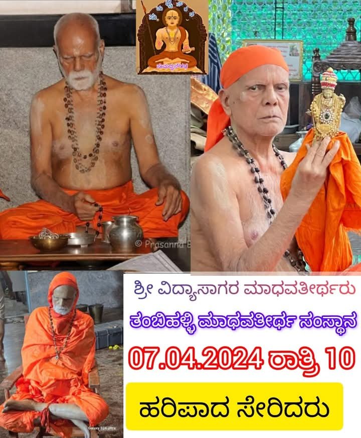 ಬೆಂಗಳೂರು: ಕೋಲಾರ ತಂಬಿಹಳ್ಳಿಯ ಮನ್ಮಾಧವ ತೀರ್ಥ ಮೂಲ ಮಹಾ ಸಂಸ್ಥಾನದ ಹಿರಿಯ ಪೀಠಾಧಿಪತಿಗಳಾಗಿದ್ದ ವಿದ್ಯಾಸಾಗರ ಮಾಧವ ತೀರ್ಥರು ಸೋಮವಾರ ರಾತ್ರಿ ಹರಿಪಾದ ಸೇರಿದ್ದಾರೆ.