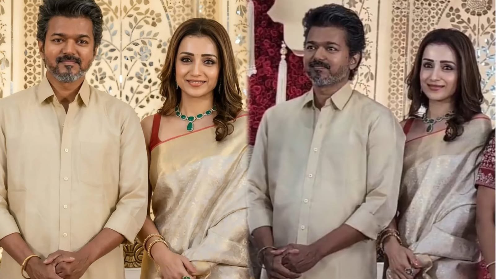 ಚಿತ್ರ ನಿರ್ಮಾಪಕ ಕಲ್ಪತಿ ಎಸ್. ಸುರೇಶ್ ಮತ್ತು ಮೀನಾಕ್ಷಿ ಸುರೇಶ್ ಅವರ ಮಗನ ಮದುವೆ ಸಮಾರಂಭಕ್ಕೆ ಇಬ್ಬರೂ ಒಟ್ಟಿಗೆ ಆಗಮಿಸಿದ್ದು ಅಲ್ಲಿದ್ದ ಅತಿಥಿಗಳು ಮತ್ತು ಅಭಿಮಾನಿಗಳ ಗಮನ ಸೆಳೆಯಿತು. ವಿಜಯ್ ಸಾಂಪ್ರದಾಯಿಕವಾಗಿ ಕ್ರೀಮ್ ಮತ್ತು ಚಿನ್ನದ ಬಣ್ಣದ ಶರ್ಟ್ ಮತ್ತು ಧೋತಿ ಧರಿಸಿ ಹೂಗುಚ್ಛ ಹಿಡಿದು ಕಾರ್ಯಕ್ರಮಕ್ಕೆ ಬಂದರೆ ಅವರ ಜೊತೆಯೇ ನಟಿ ತ್ರಿಷಾ ಸೊಗಸಾದ ಅದೇ ಬಣ್ಣದ ಸೀರೆ ಧರಿಸಿ ಮುಗುಳ್ನಗುತ್ತಾ ಸೌಮ್ಯವಾಗಿ ಅವರ ಹಿಂದೆ ಹೆಜ್ಜೆ ಹಾಕುತ್ತಾ ಬಂದರು. ಒಮ್ಮೆಲೇ ಅಲ್ಲಿದ್ದ ಅಷ್ಟೂ ಜನರು ಇಬ್ಬರನ್ನೂ ಅಚ್ಚರಿಯಿಂದ ನೋಡಿ ಫೋಟೋ-ವಿಡಿಯೊ ತೆಗೆಯಲು ಆರಂಭಿಸಿದರು. ಕೆಲವೇ ಕ್ಷಣಗಳಲ್ಲಿ ಸೋಷಿಯಲ್ ಮೀಡಿಯಾ ತುಂಬ ಇಬ್ಬರ ಫೋಟೋ-ವಿಡಿಯೊ ವೈರಲ್ ಆಗಿ ಸೆನ್ಸೇಷನ್ ಹುಟ್ಟಿಸಿದರು.