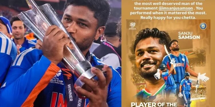 ಈ ಪ್ರತಿಷ್ಠಿತ ಟೂರ್ನಿಶ್ರೇಷ್ಠ ಪ್ರಶಸ್ತಿಯನ್ನು ಮುಡಿಗೇರಿಸಿಕೊಳ್ಳುವ ಮೂಲಕ ಸಂಜು ಸ್ಯಾಮ್ಸನ್ ಭಾರತೀಯ ಕ್ರಿಕೆಟ್ ಇತಿಹಾಸದಲ್ಲಿ ಹೊಸ ಮೈಲಿಗಲ್ಲು ಸ್ಥಾಪಿಸಿದ್ದಾರೆ. ವಿರಾಟ್ ಕೊಹ್ಲಿ (2014 ಮತ್ತು 2016) ಹಾಗೂ ಜಸ್ಪ್ರೀತ್ ಬುಮ್ರಾ (2024) ಅವರ ನಂತರ ಟಿ20 ವಿಶ್ವಕಪ್‌ನಲ್ಲಿ ಈ ಬೃಹತ್ ಗೌರವಕ್ಕೆ ಪಾತ್ರರಾದ ಕೇವಲ 3ನೇ ಭಾರತೀಯ ಎಂಬ ಹೆಗ್ಗಳಿಕೆಗೆ ಸ್ಯಾಮ್ಸನ್ ಪಾತ್ರರಾಗಿದ್ದಾರೆ. ಇಡೀ ಟೂರ್ನಿಯಲ್ಲಿ ಆಡಿದ ಒಟ್ಟು 9 ಪಂದ್ಯಗಳ ಪೈಕಿ ಸ್ಯಾಮ್ಸನ್ ಕಣಕ್ಕಿಳಿದಿದ್ದು ಕೇವಲ 5 ಪಂದ್ಯಗಳಲ್ಲಿ ಮಾತ್ರ. ಆದರೆ ಈ ಐದೇ ಪಂದ್ಯಗಳಲ್ಲಿ ಅವರು ಬರೋಬ್ಬರಿ 80.25ರ ಸರಾಸರಿಯಲ್ಲಿ ಹಾಗೂ 199.37ರ ಅದ್ಭುತ ಸ್ಟ್ರೈಕ್ ರೇಟ್‌ನಲ್ಲಿ ಒಟ್ಟು 321 ರನ್ ಸಿಡಿಸಿ ಟೂರ್ನಿಯ ಗರಿಷ್ಠ ರನ್ ಸ್ಕೋರರ್ ಆಗಿ ಮಿಂಚಿದರು. ತಮ್ಮ ಕೊನೆಯ ಮೂರು ಇನಿಂಗ್ಸ್‌ಗಳಲ್ಲಿ ಸತತವಾಗಿ 80ಕ್ಕೂ ಅಧಿಕ ರನ್ ಬಾರಿಸುವ ಮೂಲಕ ತಂಡದ ಗೆಲುವಿನ ರೂವಾರಿಯಾಗಿ ಹೊರಹೊಮ್ಮಿದರು.