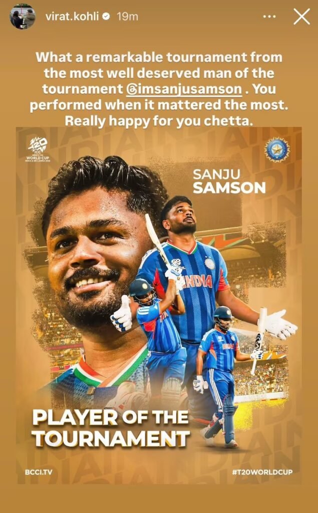 ‘ಚೇಟಾ’ ಸಂಜುಗೆ ಕೊಹ್ಲಿ ವಿಶೇಷ ಸಂದೇಶ.. ಟೂರ್ನಿಶ್ರೇಷ್ಠ ಪ್ರಶಸ್ತಿಗೆ ಭಾವುಕ ಶುಭಾಶಯ!