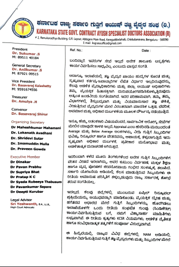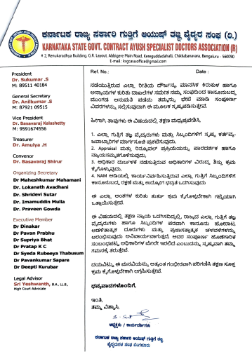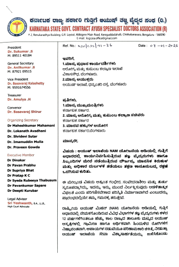 ರಾಷ್ಟ್ರೀಯ ಆಯುಷ್ ಮಿಷನ್ ಯೋಜನೆಯ ಅಡಿಯಲ್ಲಿ ಗುತ್ತಿಗೆ ಆಧಾರದಲ್ಲಿ ನೇಮಕಗೊಂಡಿರುವ ವಿವಿಧ ವಿಭಾಗಗಳ ತಜ್ಞ ವೈದ್ಯರುಗಳು ಕಳೆದ 12 ವರ್ಷಗಳಿಗಿಂತ ಹೆಚ್ಚು ಕಾಲ ರಾಜ್ಯದ ತಾಲೂಕು ಮಟ್ಟದ ಆಯುಷ್ ಆಸ್ಪತ್ರೆಗಳಲ್ಲಿ ಗ್ರಾಮೀಣ ಮತ್ತು ಆರ್ಥಿಕವಾಗಿ ಹಿಂದುಳಿದ ಜನರಿಗೆ ನಿಷ್ಠೆಯಿಂದ ಸೇವೆ ಸಲ್ಲಿಸುತ್ತಿದ್ದಾರೆ. ಇವರ ಸೇವೆ ಇಲ್ಲದೆ ಅನೇಕ ತಾಲೂಕು ಆಸ್ಪತ್ರೆಗಳು ಕಾರ್ಯನಿರ್ವಹಿಸಲು ಸಾಧ್ಯವಿಲ್ಲ ಎಂಬುದು ವಾಸ್ತವ ಸಂಗತಿಯಾಗಿದೆ ಎಂದು ಸಂಘವು ತಿಳಿಸಿದೆ.