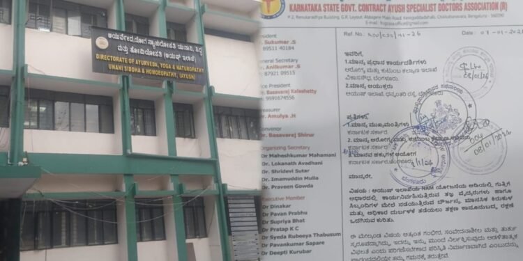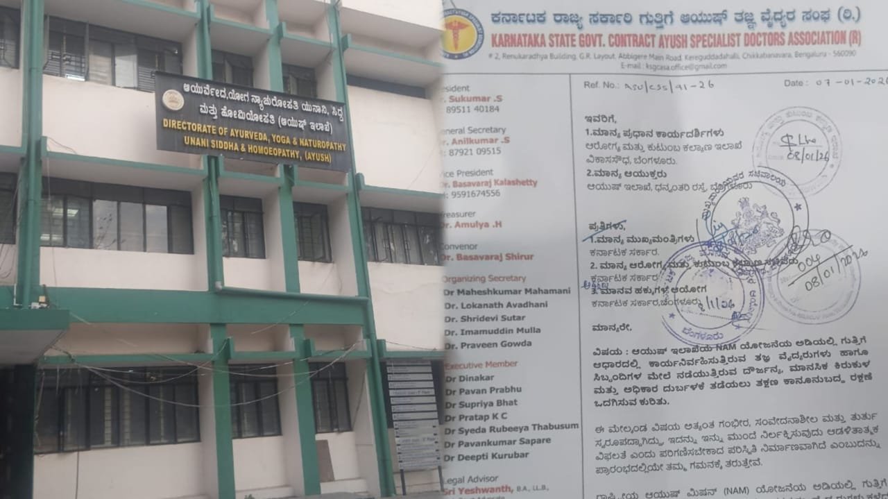 ಬೆಂಗಳೂರು: ಆಯುಷ್ ಇಲಾಖೆಯ ರಾಷ್ಟ್ರೀಯ ಆಯುಷ್ ಮಿಷನ್ (NAM) ಯೋಜನೆಯ ಅಡಿಯಲ್ಲಿ ಗುತ್ತಿಗೆ ಆಧಾರದಲ್ಲಿ ಕಾರ್ಯನಿರ್ವಹಿಸುತ್ತಿರುವ ತಜ್ಞ ವೈದ್ಯರು ಹಾಗೂ ಸಿಬ್ಬಂದಿಗಳ ಮೇಲೆ ನಡೆಯುತ್ತಿರುವ ದೌರ್ಜನ್ಯ, ಮಾನಸಿಕ ಕಿರುಕುಳ ಮತ್ತು ಅಧಿಕಾರ ದುರ್ಬಳಕೆಯನ್ನು ತಡೆಯಲು ತಕ್ಷಣ ಕಾನೂನುಬದ್ಧ ರಕ್ಷಣೆ ಒದಗಿಸುವಂತೆ ಕರ್ನಾಟಕ ರಾಜ್ಯ ಸರ್ಕಾರಿ ಗುತ್ತಿಗೆ ಆಯುಷ್ ತಜ್ಞ ವೈದ್ಯರ ಸಂಘವು ಆರೋಗ್ಯ ಮತ್ತು ಕುಟುಂಬ ಕಲ್ಯಾಣ ಇಲಾಖೆಯ ಪ್ರಧಾನ ಕಾರ್ಯದರ್ಶಿಗಳು ಹಾಗೂ ಆಯುಷ್ ಇಲಾಖೆಯ ಆಯುಕ್ತರಿಗೆ ಪತ್ರದ ಮೂಲಕ ಕ್ರಮ ಕೈಗೊಳ್ಳುವಂತೆ ಮನವಿ ಸಲ್ಲಿಸಿದೆ.