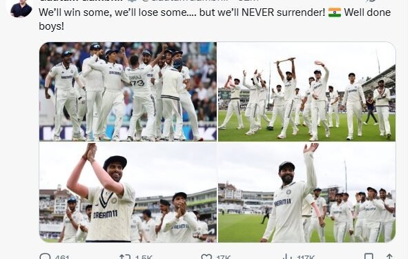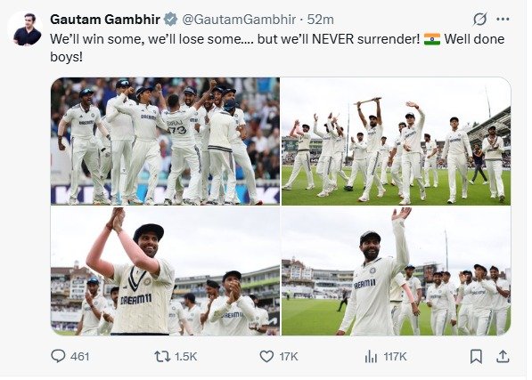 ತಮ್ಮ ವಿಶಿಷ್ಟ ಶೈಲಿಯಲ್ಲಿ, ಗಂಭೀರ್ ಅವರು ಸಾಮಾಜಿಕ ಜಾಲತಾಣ ‘ಎಕ್ಸ್’ (ಹಿಂದಿನ ಟ್ವಿಟರ್) ನಲ್ಲಿ, “ನಾವು ಕೆಲವು ಪಂದ್ಯಗಳನ್ನು ಗೆಲ್ಲುತ್ತೇವೆ, ಕೆಲವು ಪಂದ್ಯಗಳನ್ನು ಸೋಲುತ್ತೇವೆ. ಆದರೆ ನಾವು ಎಂದಿಗೂ ಶರಣಾಗುವುದಿಲ್ಲ. ವೆಲ್ ಡನ್, ಹುಡುಗರೇ!” ಎಂದು ಬರೆದುಕೊಂಡಿದ್ದಾರೆ.