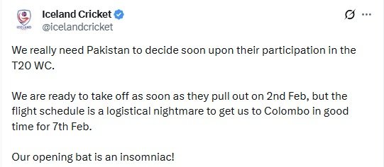 ಬಾಂಗ್ಲಾದೇಶ ತಂಡವು ಭಾರತಕ್ಕೆ ಪ್ರಯಾಣಿಸಲು ನಿರಾಕರಿಸಿ ಟೂರ್ನಿಯಿಂದ ಹೊರಬಿದ್ದ ನಂತರ, ಪಾಕಿಸ್ತಾನ ಕೂಡ ಇದೇ ರೀತಿಯ ಬೆದರಿಕೆ ಹಾಕುತ್ತಿದೆ ಎಂಬ ವದಂತಿಗಳ ಬೆನ್ನಲ್ಲೇ ಐಸ್ಲ್ಯಾಂಡ್ ಈ ಟ್ವೀಟ್ ಮಾಡಿದೆ.